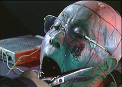 Fortunately this speculation tends to be dispelled for most viewers upon watching the third Guinea Pig film and its successors, all of which are more cartoonish and wildly varying in quality. The third released entry, Android of Notre Dame, is a much "safer" viewing experience. Sort of a post-splatter remake of The Brain that Wouldn't Die, this follows the misadventures of a demented dwarf scientist (Toshihiko Hino) who conducts experiments involving the yammering, rotting severed head of an extortionist to save the life of his stricken sister. He then kidnaps a woman and performs some perfunctory gore procedures on her before the morose finale. Filled with ranting, raving, and ludicrous gore FX (including a disemboweling that's more silly than it is sickening), this is an odd and frequently perplexing piece of cartoonish grue to say the least.