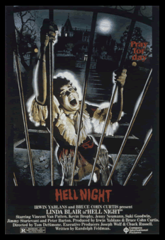 which finds four college pledges forced to spend Hell Night in Garth mansion, where the owner killed his wife and three of his four children twelve years earlier. The disfigured youngest son, so the legend goes, continues to roam the house, which lacks such features as electricity and a telephone. Our virginal heroine, Marti (Linda Blair, doing a nice job), pairs up with the nice guy, Jeff (Peter Barton of Friday the 13th: The Final Chapter and TV's The Powers of Matthew Starr). Meanwhile, naughy boy Seth (Rock 'n' Roll High School's Vincent Van Patten) chases after British druggie slut Denise (Suki Goodwin), so the latter two spend most of the film in their skivvies. Meanwhile, some frat and sorority pranksters sneak around outside the house to play tricks on the four victims but wind up being dispatched themselves by a hulking killer. Will our resourceful quartet of pledges make it out alive before dawn?