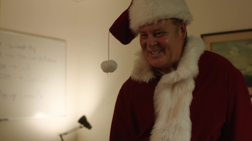 supernatural yarn about a doll that ends up in the possession of young Kevin (Campbell) as a gift from his parents while they're off for a short trip abroad. In the meantime he's being taken care of by the world's worst babysitter (Stonebreaker), who plans to burgle the entire house with her shifty boyfriend... but they've got a surprise coming. Fans of killer doll stories will get a kick out of this one, particularly given the nifty holiday twist here and the satisfying E.C. Comics vibe. In "Christmas Carnage," recovering alcoholic Chris (Murray) is up for a promotion but won't stand up for himself, much to the consternation of his wife who'd rather have office party sex with his boss who likes dirty Christmas talk. Falling off the wagon with a vengeance and wearing a Santa outfit, he decides to find his assertive side at last in the bloodiest way possible. Nicely acted and balancing laughs with splashy gore, it's a tie with "Dreidel" as the strongest entry of the film. Finally "Room to Let" concerns young Anna (Ralston), who takes a room at a seaside boarding house only to find out that there's a strange, torchlit ceremony going on nearby at night. The further she investigates in town, the darker the secret of the area's winter solstice appears to be. Straightforward and fairly grim, this one at least has some nice atmosphere and ties in well with the wraparound story for one extra little