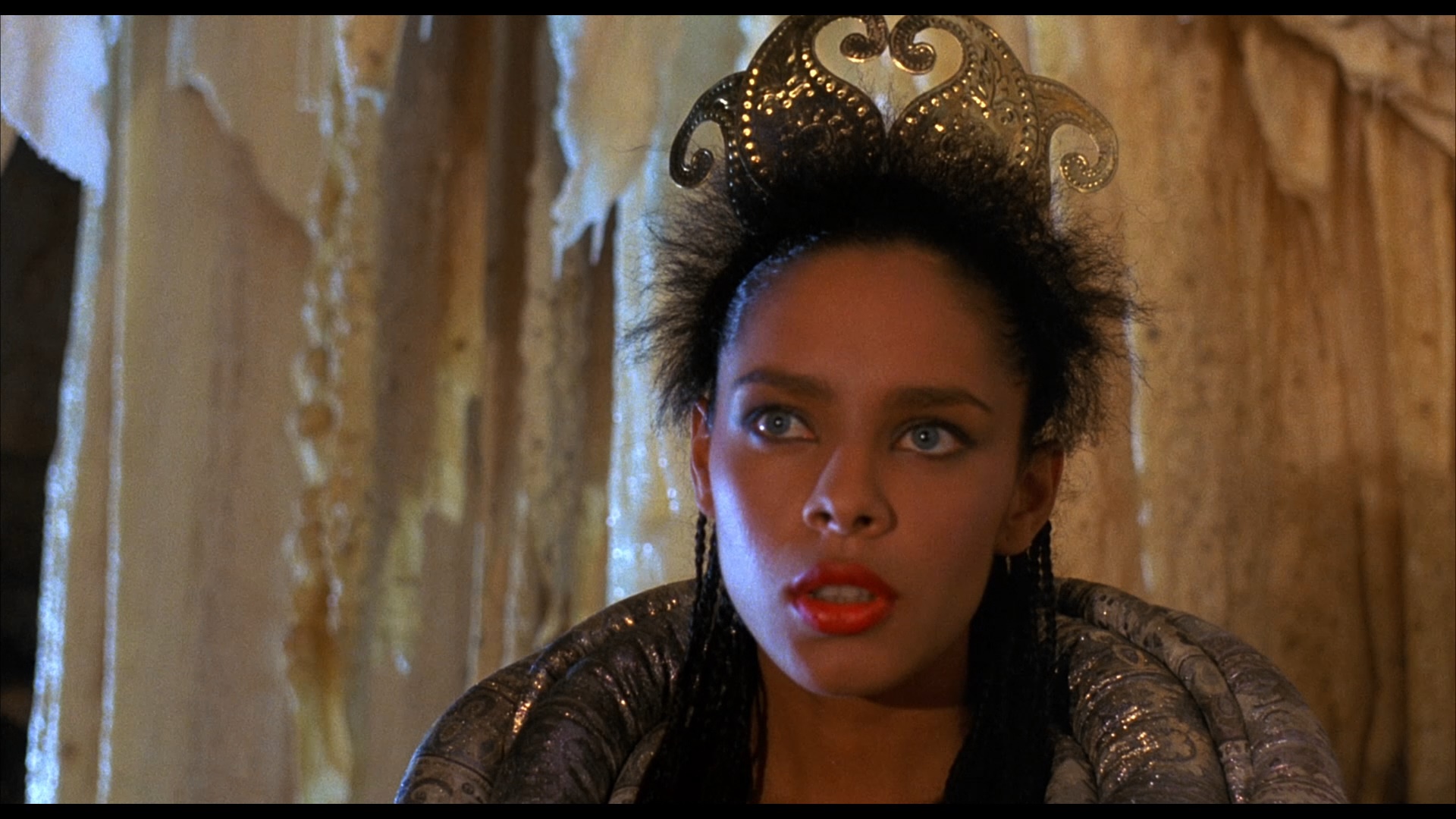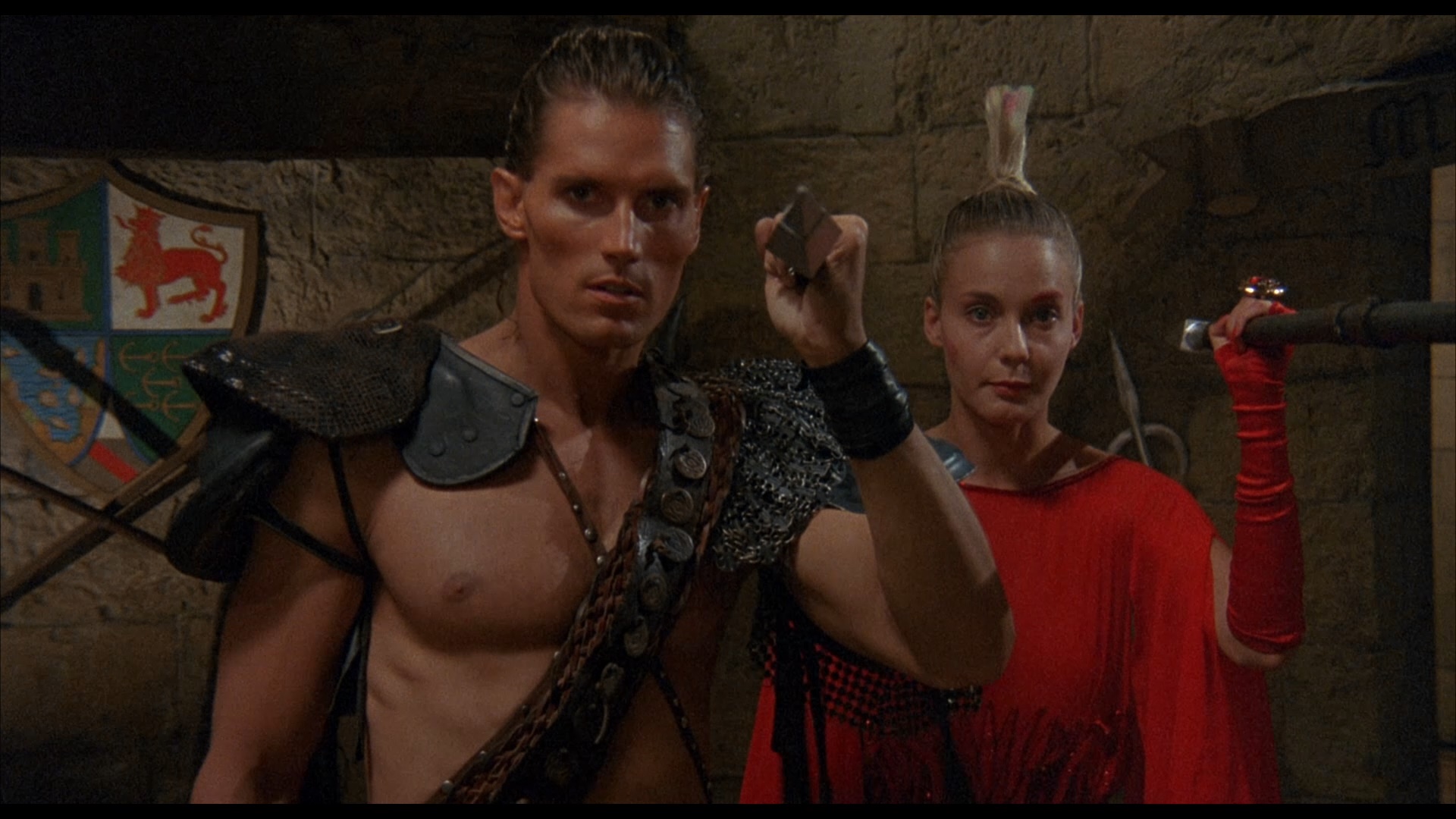 a snazzy red scarf, just the thing to wipe out the entire birthday party for Princess Janna (Sonny Boy's Gersak) when Phaedra decides to show up and put a curse on her. Janna ends up on a journey with Ator (O'Keefe), now sporting a completely different hairstyle and earring, and they face off against a number of arbitrary foes and challenging caves for a date with destiny against the conniving witch and her strongman, who happens to have a very personal connection to Ator.
