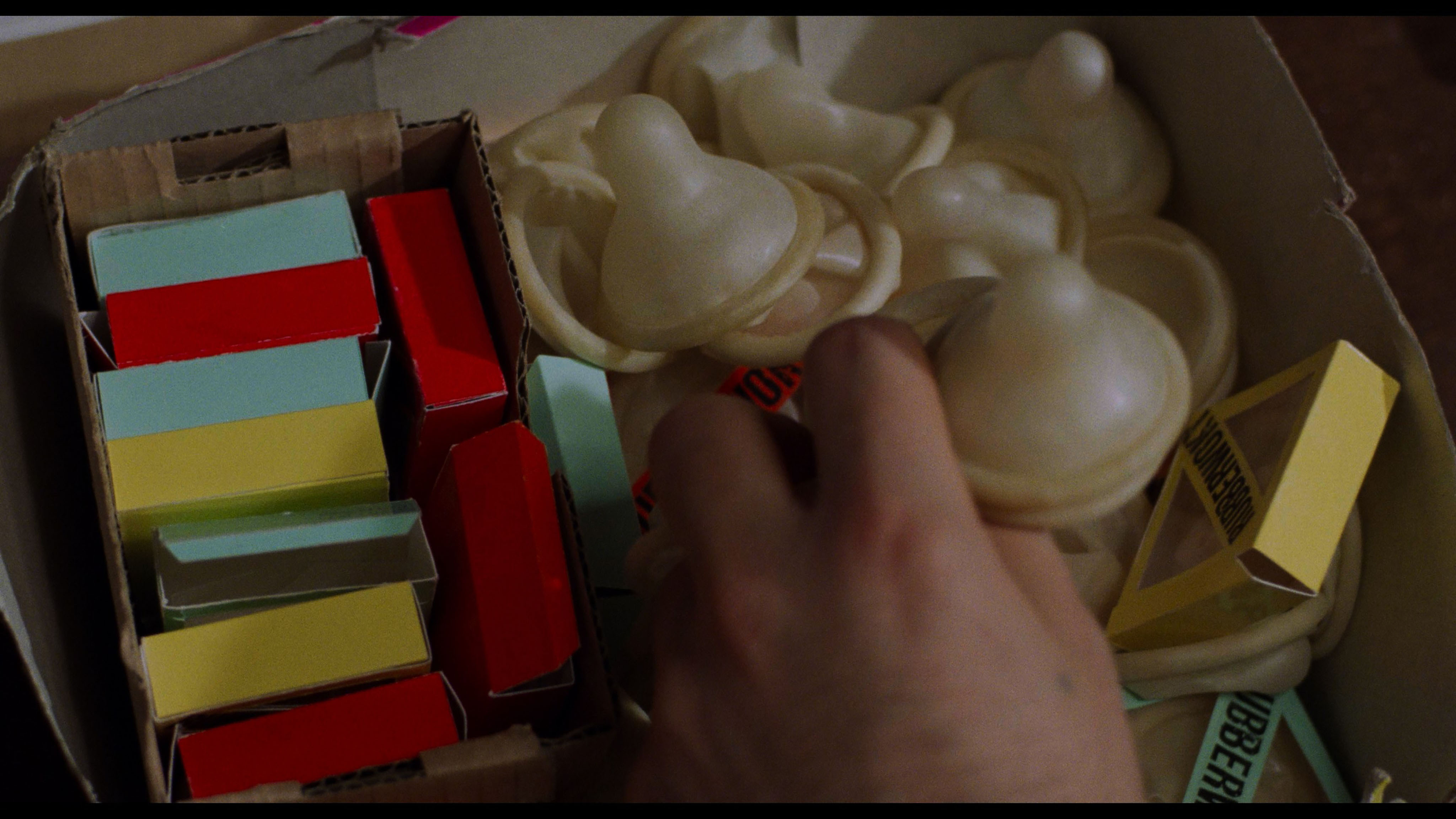 The second Blu-ray features the original 108-minute theatrical cut of the film, in equally excellent quality and featuring the archival Waltz and Buttgereit commentary. In "Holy Mackeroni!" (18m45s), Walz and Samel have a great time looking back at the film and swapping funny stories from the set, including comparisons to Samel's previous cop roles and working with aggressive condom puppets. "What Is This?" (14m3s), features actor Adriana Altaras very vigorously talking about the making of the film, along with her professional history after growing up in Croatia. In "It’s Just a Movie" (22m49s), actor Peter Lohmeyer covers his move into acting after considering going into social work, his earlier gay-themed gig on Maybe... Maybe Not, and his encounters with Walz that ended up getting him a very vivid role in this film dressed up in leather gear. "Really Special Items" (14m21s) features prop collector Roman Güttinger showing off his very impressive storage area loaded with horror items including extensive key items from this film -- some of which you won't believe. Then you get a 2003 short film by Waltz, Ich hätt’s ihm früher sagen sollen… (7m27s), about two women having a unique kind of guy trouble, an archival making-of featurette (9m37s), a raw 10m49s reel of production footage, some EPK-style cast interviews (8m57s) from the set, a silly archival "Would You Use This Condom?" featurette (1m55s) with man on the street interviews, the theatrical trailer, and a video trailer.