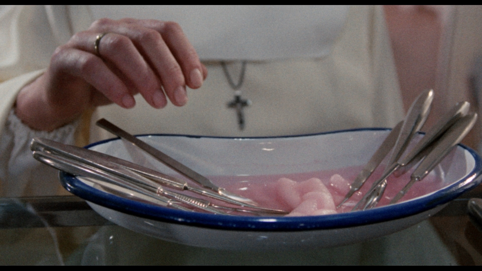 amount of what looks like normal film grain, but some scenes have an oddly processed veneer as well that teeters over into that odd digital watercolor effect. On the audio front as we finally, finally have the complete original Italian track (in DTS-HD mono like the English one), which is vastly preferable in every respect to the English dub. Several of the performers are speaking Italian in their original voices (including the always awesome Alida Valli in what amounts to an extended cameo), and the dialogue is far more polished and involving by comparison. There are also many, many more extra lines in the Italian version, too, when characters are speaking offscreen, and thankfully English subtitles are available both as SDH for the English dub and a straight translation from the Italian one. Additional subtitles are also presented in French and Spanish if you want to learn how to say a lot of bilingual Catholic jargon.