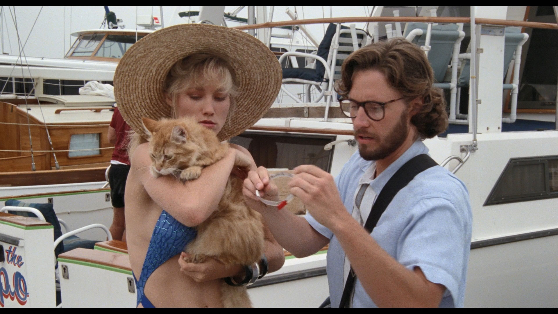 increasing difficulty of raising funding for genre films, the casting process, the addition of existing action footage from one of his prior films, the tricks of drowning an actor on camera, and of course, the treatment and happy fate of the film's feline star. Cinematographer Nicholas von Sternberg (of Dolemite and Tourist Trap fame) turns up for the new "That Darn Mutant Cat!" (9m53s), covering his memories of working with Clark, the challenges of shooting felines ("Cats don't like the water!"), his "skeptical" reaction to the script, and his mixed feelings about the final result as well as his pride (or lack thereof) in his various projects. A jerky standard def video trailer is also included with a very funny tagline at the end. A limited (2,000-unit) embossed slipcover edition designed by Earl Kessler Jr.) is also available.