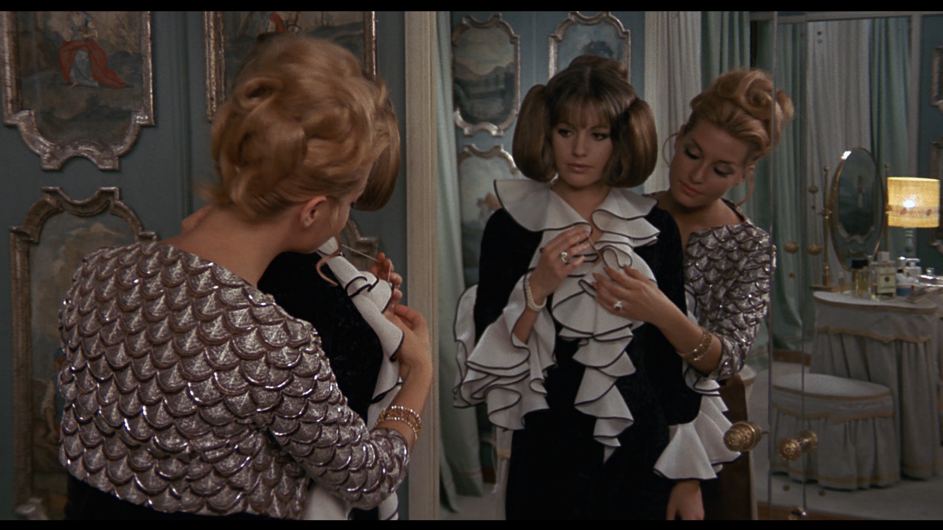gave the film its English-friendly Blu-ray debut as a stacked special edition featuring pretty much everything you could possibly want. The disc contains both the Italian version (94m25s), with Italian and English audio (the former sounding much better but the latter more in sync, with optional English subtitles) and the spicier Audubon version (which features a reworked dub track supervised by Radley Metzger), in English or Italian with optional English SDH or English translated subtitles. The two versions are presented as separate encodes with the Italian version getting a higher bit rate, occupying 25.1GB of the disc versus the Audubon's 14GB. However, in motion they're very similar with identical color timing and detail levels. The packaging notes the film has been "restored from the best available elements," and while this is hands down the best it's looked on video video by a wide margin, it still has issues in keeping with the somewhat tattered history of this film over the years and its current state. The detail level here is quite soft with some obvious filtering (especially the first reel) which appears to have been applied to mitigate damage, including attempts to spackle over some tears and warping on some frames that can still be partially seen if you're paying attention; also there's a visible image shift for a frame or two at each edit, which will take some getting used to especially on larger displays and projectors. Interestingly, as the film goes along it looks more natural with more film grain and minor debris in evidence, so who knows? Complicating matters is the fact that the film deploys varying types of filters and varying film stocks throughout (including some fairly aggressive diffusion on some shots of Spaak), which becomes even more apparent in HD. The colors look gorgeous here and really make the film a delightfully splashy experience, which makes the difficulty of finding much of Campanile's other work even more frustrating. The Italian version can also be played with a new audio commentary by Kat Ellinger, who really bores into Campanile (not just as a director) including his gravitation to comedy and the themes of