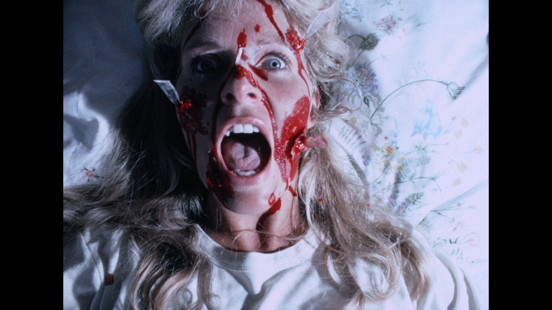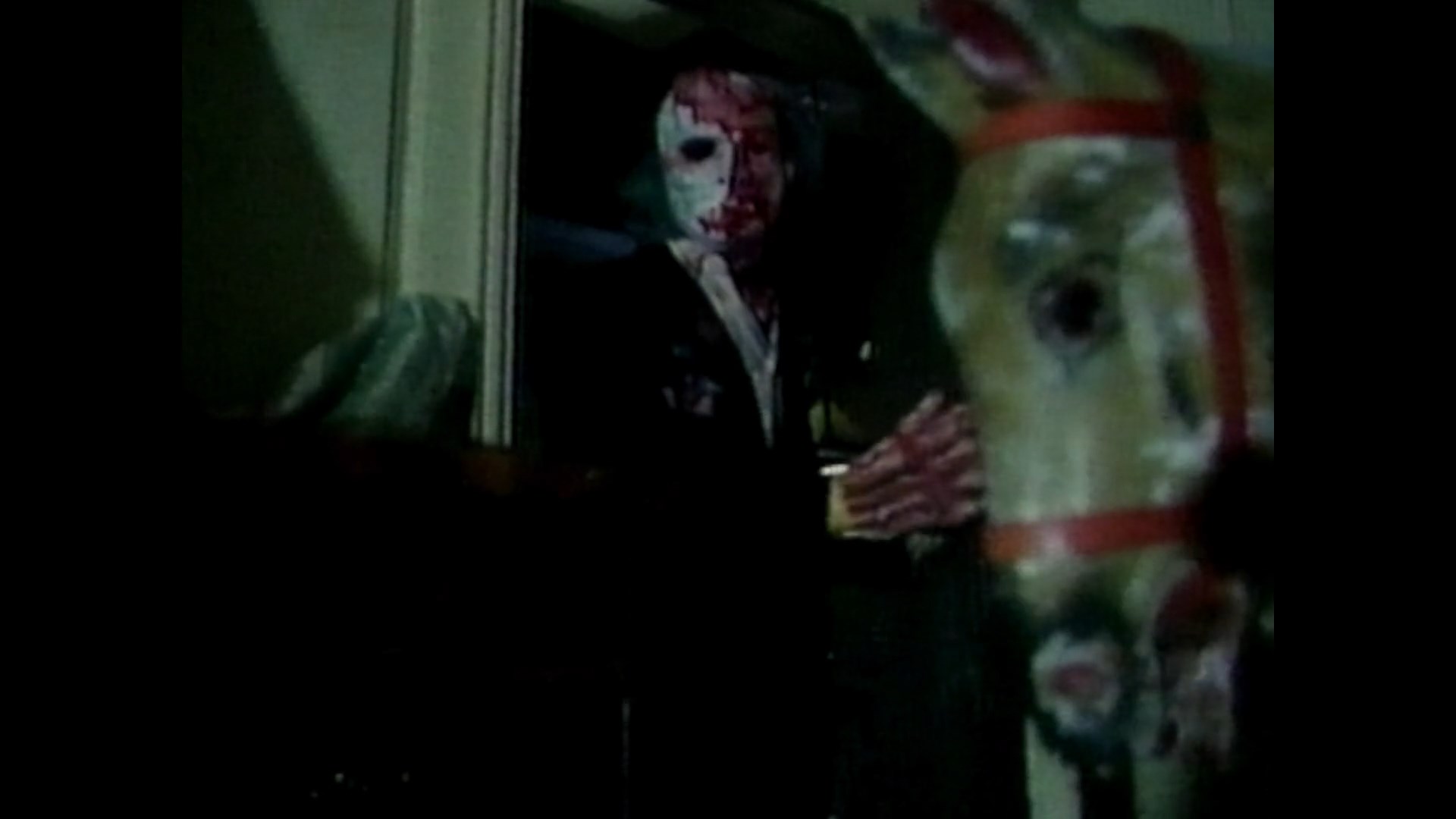roped into a pagan with some weird customers like mute, homicidal handyman Maurice (Colin Efford) who practices shirtless weightlifting while staring at nudie pinups on his wall. Hall turns up here again in a much smaller role, with Efford getting the most memorable part here. It's a very memorable film that turns some wild turns on the way to its vivid, gut-ripping demonic finale, with a few effective stalk-and-slash kills sprinkled in along the way. The droning electronic score is a big plus as well, making this an easy recommendation for fans of '80s British horror. The 1.33:1 presentation is mostly taken from a 2K 16mm restoration, though unfortunately no film elements exist for the last 10 minutes which are pulled from tape. There's an option to view either the original version or a revised 2008 one prepared for the film's 2008 Sarcophilous Films DVD edition, which completes some of the red eye special effects in the final stretch. The companion film, The Last Night (46m36s), is a more straightforward slasher as the final night of a theatrical production called Murder in the Dark gets crashed by a couple of "armed and extremely dangerous" convicts escaped from nearby Broadmoor prison. Soon people are getting snatched, throats are slashed,