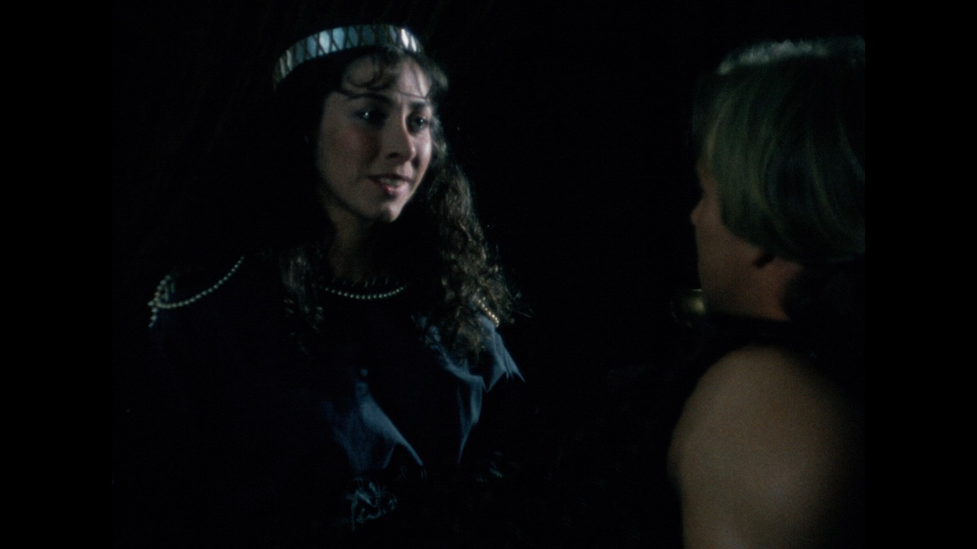 disc five with 1989's Avalon (84m8s), whose film elements also went up in smoke and which is presented here from the best surviving SD source. The Excalibur influence still carries on here, albeit with some insane shiny outfits straight out of a TV variety show, with the Arthurian saga about the evil reign of Morgana (Debbi Stevens) whose sacrifice of the poor Clothilde (Abigail Blackmore) is thwarted by stud-muffin swordsman Owen (Stephen Harris). Accompanied by thief Keiran (Bartlett again) and Merlin (Olliver), they set off for the fabled land of Avalon where they can retrieve a mystical sword capable of vanquishing the tyrannical sorceress and her army of white-robed Druids. Again your tolerance for zero-budget sword and sorcery antics will determine how much you enjoy this one, but it packs a lot of action and goofiness into the running time (not to mention plenty of mullets).