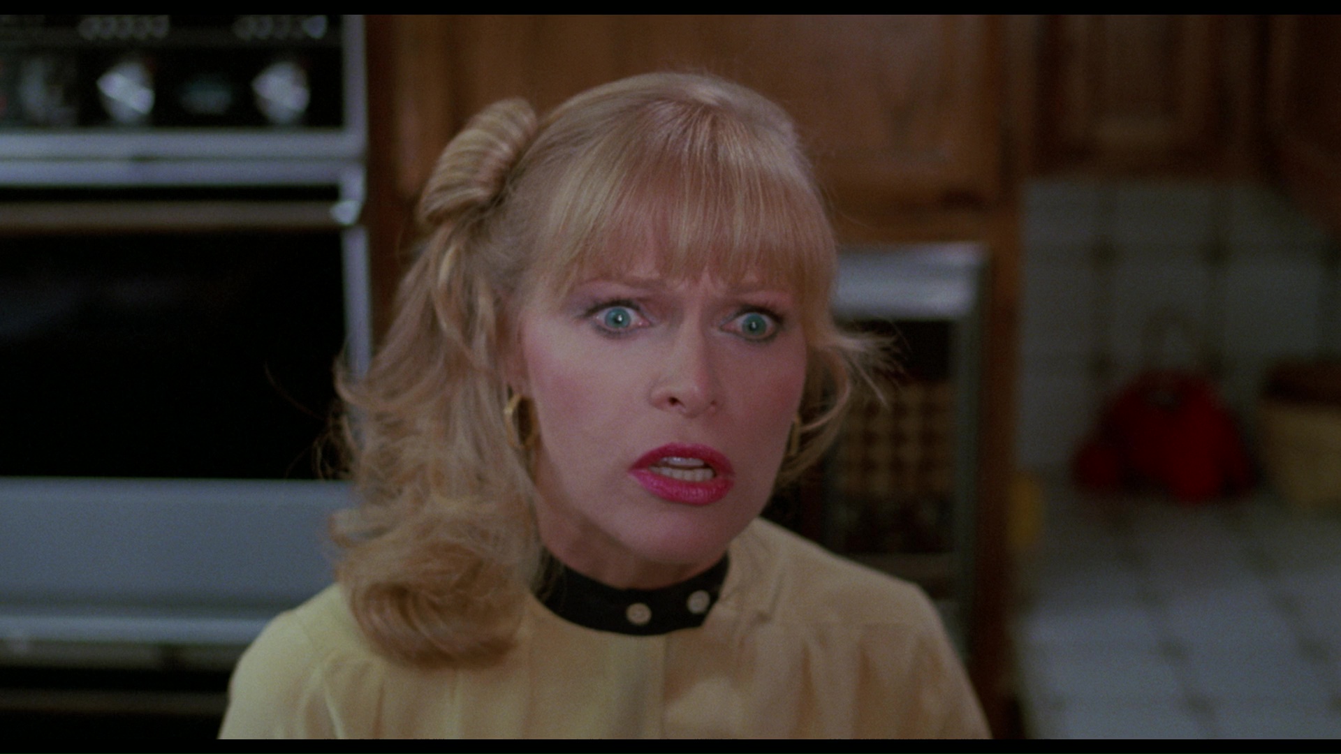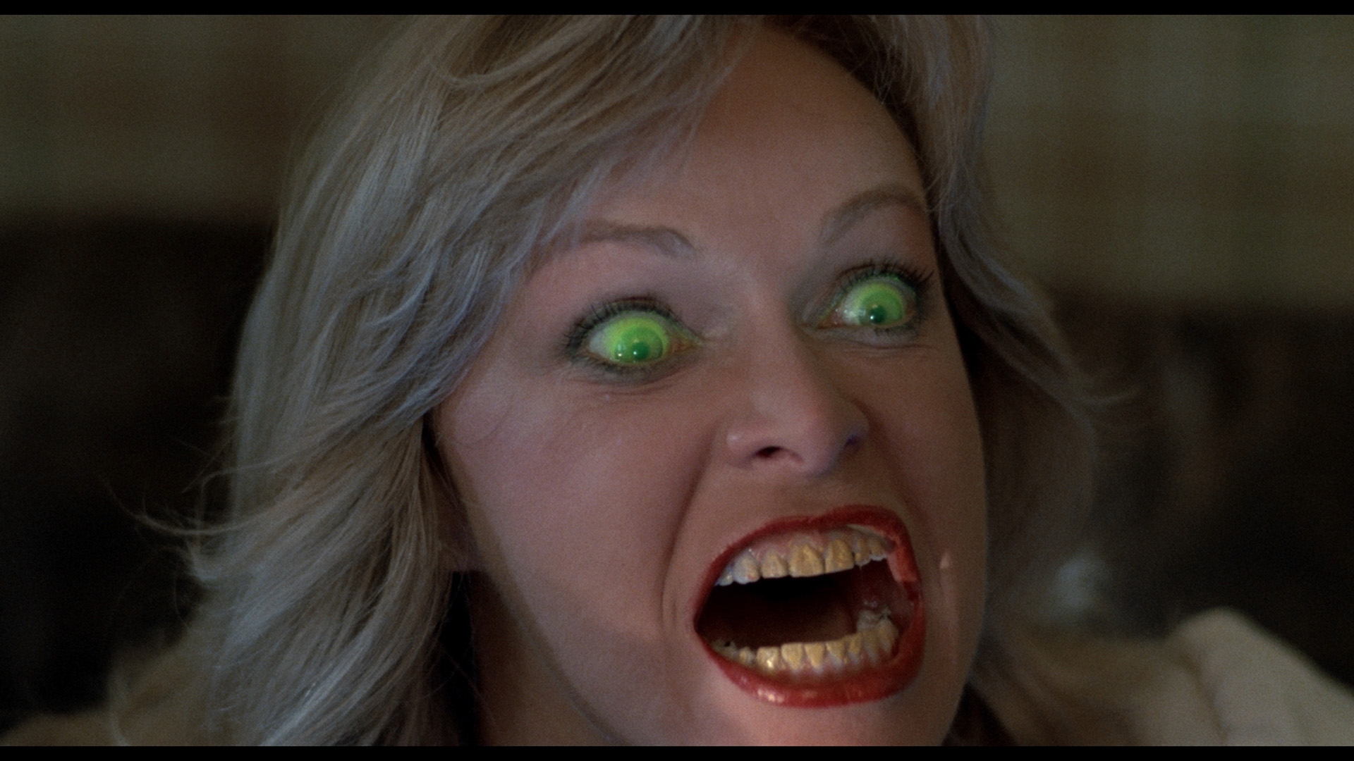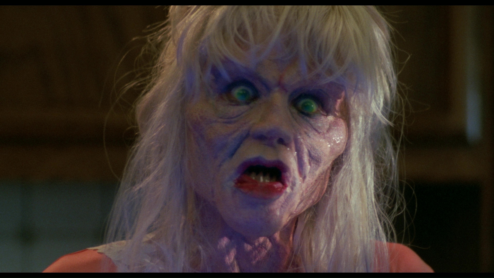 In 2018, Vinegar Syndrome bowed the title on Blu-ray and DVD for its worldwide HD debut as a Black Friday dual-format slipcase edition. Despite claims that ratty theatrical prints were the only game out there, this release proves otherwise as it's taken from the original camera negative and looks absolutely stunning. The stylized lighting schemes really pack a punch here, and far more image info is visible compared to past release as well. This is also the uncensored version of the film complete with the head explosion, which is great to finally have back in action. The English LPCM mono track is also in better shape, though the original sound mix (with tons of sibilance, especially from Bresee) has never been that hot in the first place. The main extra here is "Making Monsters" (8m39s), a new video interview with Buechler who chats about Bresee being a trooper even when having an allergic reaction to her makeup, the dubious nature of crediting Michel Dugan as the director, the optometrist brought on board to come up with those crazy gel contact lenses (used again in Ghoulies), and plenty more. The theatrical trailer is also included (in gorgeous quality) along with two TV spots and a gallery of lobby cards and other promotional material.