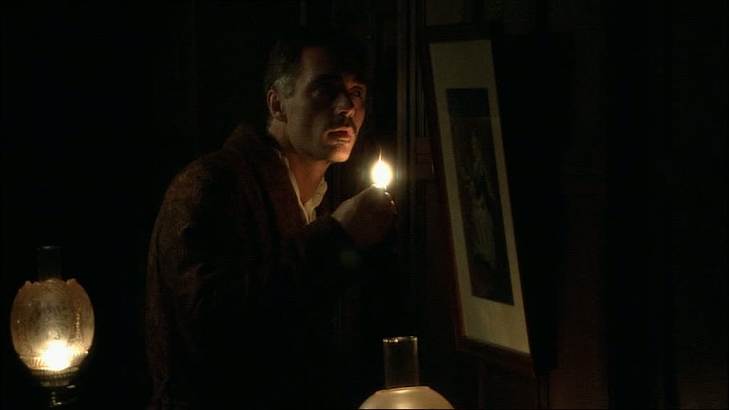 That story is the first on the fifth and final DVD, and luckily the technical chops of the next year's offering, "Number 13," are much better. It's a beautifully rendered little spooker that admirably captures the diabolical visual flair of the classic episodes, albeit with a glossier new sheen. The very good TV actor Greg Wise (who appeared in Sense and Sensibility and went on to marry Emma Thompson) takes charge here as the studious Professor Anderson, who causes some difficulty at his hotel when they can't seem to provide a room complete with both a comfortable bed and a good working desk. Finally he finds what he wants in Room 12, which is situated next to Room 14... with no number 13 between them. Another scholar had disappeared on the premises suddenly without paying his bill, so he has to pay upfront before beginning his work-- which takes him into a dark history involving witchcraft, local scandal, and Heironymous Bosch's painting, "The Garden of Earthly Delights." Most unsettlingly, in the middle of the night he hears disturbances... and when he walks outside, Room 13 is suddenly situated next door. What's inside the room, and can he unravel its mystery before the demonic danger inside claims him?