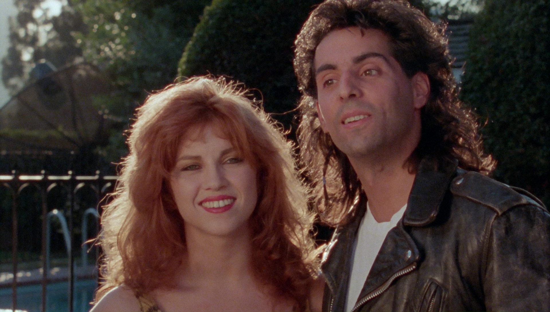 Just as skin-filled but much lower on the blood quotient, Deadly Embrace compensates by amping up the weird quotient for the story of pampered SoCal housewife Charlotte Moreland (Caged Fury’s Miller, billed as “Ty Freeman”), an incessantly horny and voyeuristic lady who enjoys watching guys through the one-way glass in her guest room closet. She’s married to the inattentive Stewart (Vincent), who’s distracted by an affair at the office, so instead Charlotte turns her attentions to Chris (current reality show editor Abraham), the handyman and gardener who hangs around the house far longer than his work shift and tempts her by the pool when he isn’t busy making phone calls to his girlfriend (Quigley). The whole thing is framed with police interviews (with no faces shown) so we know it all ends badly, and boy, does it ever.