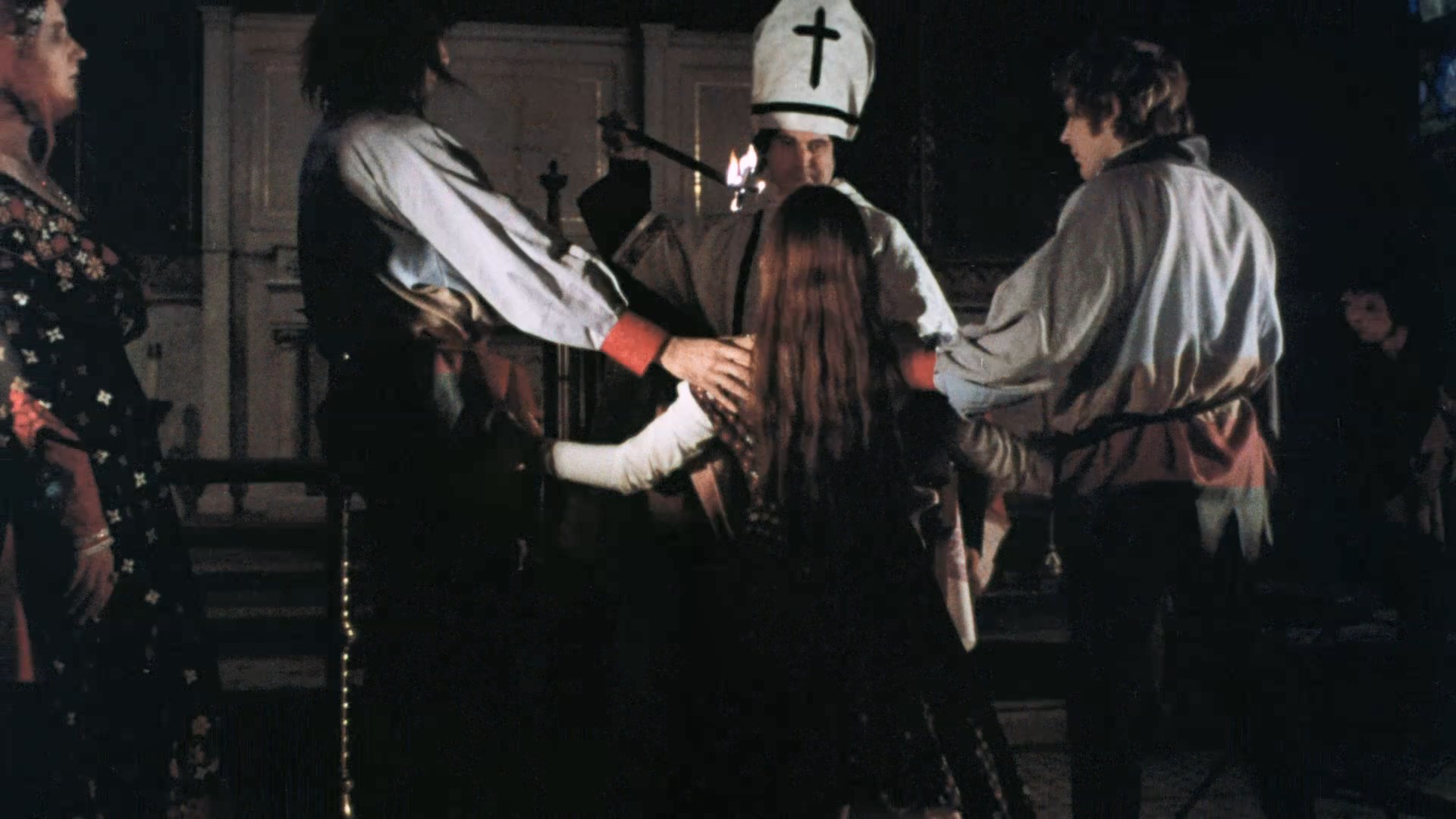 NYC cheapjack film distributor William Mishkin, both scissored to get an R rating and yet still comparatively popular in their compromised forms. First is Torture Dungeon, essentially Milligan's take on violent Shakespearean tragedies like Richard III but staged in the wilds of Staten Island with a bevy of colorful costumes and theatrical sets (as well as sparing but effective gore effects). Here Milligan vet Gerald Jacuzzo, a.k.a. "Jerremy Brooks," gets to take center stage as the debauched Duke of Norwich and gets to spearhead tons of juicy, overripe dialogue in a cast of prime Milligan oddballs for a production originally shot in 1968 as Macabre (so it really predates the British period). Rogers gets an equally incredible role here as a wizened crone named Margaret who's privy to the Duke's hellish torture dungeon of the title and conceals a dreadful family secret, while Borske and another beloved repertory member, Neil Flanagan, get some plummy one-liners as well. (It's also one of the prime examples when you can hear Milligan fleetingly yell directions off camera, a charming quirk if you take it in the right spirit.) The plot's your usual deal about a would-be despot conspiring to murder his way to the throne, with his sister, Lady Jane (Dillon), even inflicted with the growing spawn of their incest. Stuck in the middle is skinny dipping, dress-popping peasant girl Heather (Cassidy), who has a boyfriend but turns into the Duke's pawn in an intricate game of family musical chairs. Along the way you also get a deeper look at the Duke's bedroom proclivities, which incorporate another of Milligan's