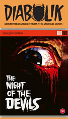 A gray market staple for many years, The Night of the Devils has primarily been seen by fans in copies made from the long unavailable Japanese VHS edition from the '80s. The very good English dub (which thoughtfully gives many of the characters semi-Slavic accents) was used for this uncut version, but the scope compositions were noticeably cropped. The Raro DVD marks the film's first official American release, and its legitimate availability at last should help bolster its reputation among those who have never seen it in prime condition. Of course, newcomers to Italian horror should find it pretty startling, too. Image quality is very good, with what appears to be accurate framing and very satisfying colors (including, of course, really rich reds). The disc defaults to the Italian-language version with optional subtitles in either English or German(!), but the English dub is included as well. The first option sounds quite good, and the subtitles aren't quite dubtitles; some scenes play out more or less exactly the same as the English track, while others have quite a few variations with a few extra lines of dialogue thrown in here and there, too. Unfortunately the English track isn't remotely as impressive; the music in particular sounds warbling and distorted in spots (especially the end of the main titles). The packaging indicates an original English trailer, but that's nowhere to be found. However, you do get two video extras; the first features Fangoria editor Chris Alexander (standing very, very close to the camera and apparently shot as a mirror reflection) enthusiastically talking for 5m41s about the film's participants and its history, while Gaslini gets a 32m14s video interview in which he discusses his move from jazz to film scoring, his thoughts on this film, working with Argento on TV and film projects, and much more. It's presented in completely raw, unedited form with English subtitles, so you'll get occasional disruptions like someone moving a chair in front of the camera. Alexander also contributes some liner notes putting this in context with other '70s horror