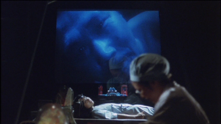 It all starts on a dark night in a scientific lab where an excited scientist has discovered a special process allowing access to the world of dreams, "something that even Freud and Jeung were unable to accomplish!" -- at which point he and his nurse appear to be murdered. Cut to a graveyard where a session of bondage-flavored nookie is interrupted by a huge spider that sends the terrified woman, Reiko (Miho), into a severe case of genital lockjaw. Diagnosed with "genophobia" at the hospital, she's ordered to stay under observation for a week(!) at the Tachnibana Clinic for further study. As it turns out, she's going to be the newest guinea pig in that dream project, which involves some tinkling metal bells inserted very inappropriately inside her nether regions and a metal Dream Ring "equipped with a microcomputer and special sensors," allowing playback of a patient's dreams because, ahem, "women dream with their wombs." The project is being supervised by Dr. Katsuragi, with female Dr. Akizuki handling the dirty work herself.