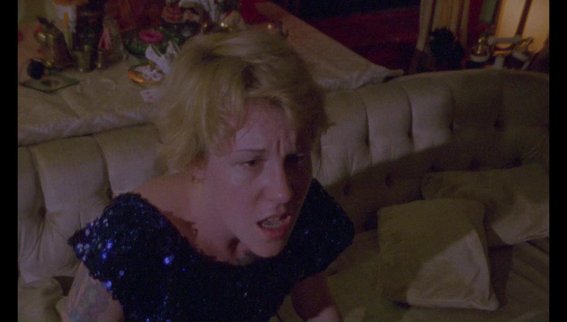 compared to what were clearly bright, vivid shooting conditions on the set, and the presentation accurately reflects that with some occasional flecks and specks giving it that extra filmic flavor. One sequence fairly early on had to be pulled from a backup DVD and tweaked to sort of match the rest of the film after the original elements went missing, so you'll notice a bit of a quality shift for about five minutes or so. The LPCM English 2.0 track does a fine job with the great soundtrack. Director Peter Romero Lambert and cinematographer/producer Joe Rubin (of Vinegar Syndrome) appear for a terrific audio commentary that answers virtually any question you could have and chatting as they chat about the influence of Taxi Driver and Straw Dogs, the consequences of partying hard the night before a shoot, the video store Odd Obsession that connected most of the non-actor casting choices, the rewrites necessitated when Vernon wasn't available to finish the film, and plenty more. The 19-minute "Knife in the Eye" goes behind the scenes with Vernon in her performance art gear appearing in wraparounds for a variety of behind-the-scenes segments (including a lot more male skin if the main feature didn't provide enough), a deleted 2-minute "magic lemonade" scene that goes into simulated water sports territory, the original trailer, a 6-minute still gallery, and bonus trailers for Six Pack That Bitch and the upcoming sequel, Jill 2: Hollywood Blue, which looks absolutely wild.