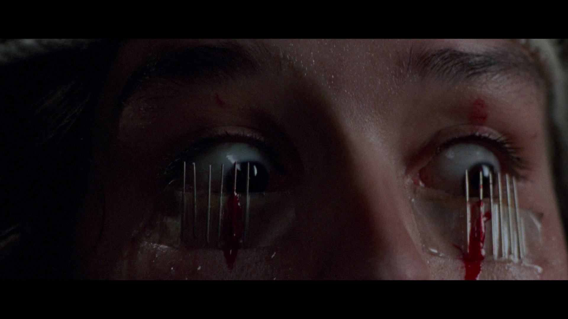 The deluxe Scorpion version also landed in 2019, featuring three Blu-rays from the same scan with some additional image stabilization. Disc one has the uncut version framed at 2.35:1 with English stereo, 5.1, Italian mono (labeled as stereo), and the Cannes mono English track with optional English subtitles labeled as being for the English or Italian tracks. That's actually a mistake as both are dubtitles for the English track, which makes the Italian version completely incoherent at times (especially the last couple of minutes). Extras include the Argento interview, the international English trailer, a 17m11s interview with Tassoni about her work on this film after Demons 2 and her memories of Argento, and an audio commentary by yours truly. Disc two features the completely opened-up 1.78:1 version which makes for a fun idea of how this might have played in IMAX, with English stereo and 5.1, Cannes English, and Italian options with the same English subs, plus a solo audio commentary by Troy Howarth. The McNamara interview is ported over here, plus the "Opera" music video and an 11m10s interview with Barbara Cupisti about her minimal role and her mingling with Michele Soavi and Dario Argento around that time. Finally on disc three you get the U.S. Orion cut (framed at 2.35:1, which is funny as that cut was only issued opened up to 1.85:1 for American and Japanese theatrical prints), with English 2.0 stereo. Here you get the heftiest video extras including "Notes and Nightmares" (29m47s) with Simonetti, "Who Did It and Who Am I?" (37m21s) with screenwriter Franco Ferrini, "Revenge of the Crows" (15m9s) with Stivaletti, "The Eyes and the Needles" (14m1s) with makeup artist Franco Casagni, "To Catch a Killer" (15m16s) with Barberini, "The Curse of Macbeth" (13m31s) with press agent Enrico Lucherinni, and "With Open Eyes" (36m10s) with film historian Fabrizio Spurio. All of these feature the longest and most overstuffed English subtitles you've ever seen. Also included are the raw behind-the-scenes footage (44m32s) with the U.S. trailer.