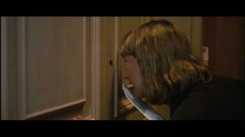 A fascinating pair of alternate audio versions of Opera could be heard on the UK DVD release from Arrow, featuring equally flat image quality and identical framing to the Anchor Bay presentation, with the first disc release of the original dub track heard at Cannes with Barberini's prissier voice (which fits far more organically into the soundtrack). Note that the music mix is also slightly different, Operafeaturing yet another variation on the radio music during the first eye-taping scene. That DVD contains the original Italian audio in a very robust presentation which even outclasses the Italian DVD. The front and rear speakers are the most active of any available mix, and the disc also includes optional English subtitles, making this the first legitimate subtitled edition. Completists will also note that only the Italian version concludes with a male narrator relating most of Betty's pro-nature speech at the end, though it's still translated in the first person for some reason. (The subtitles appear to be translated from the Italian track, not transcribed from the English one.) Several passages of music in the Italian version are nonexistent in both English ones; for example, during Ian Charleson's bedroom conversation with his girlfriend in which they read the early newspaper reviews, Simonetti's "Crows" can be heard playing on the radio in the background, and Betty's stroll through several hallways of red curtains after the air duct sequence and Ian Charleson's Hamlet reverie are accompanied quite audibly by Simonetti's "Confusion." In the English version, both scenes are severely muted down in the sound mix to the point of invisibility. Also in the Italian version, an ironic song gurgles on the radio during Betty's first needle experience, though here the only music during Operathe scene is a barely audible Brian Eno piece.