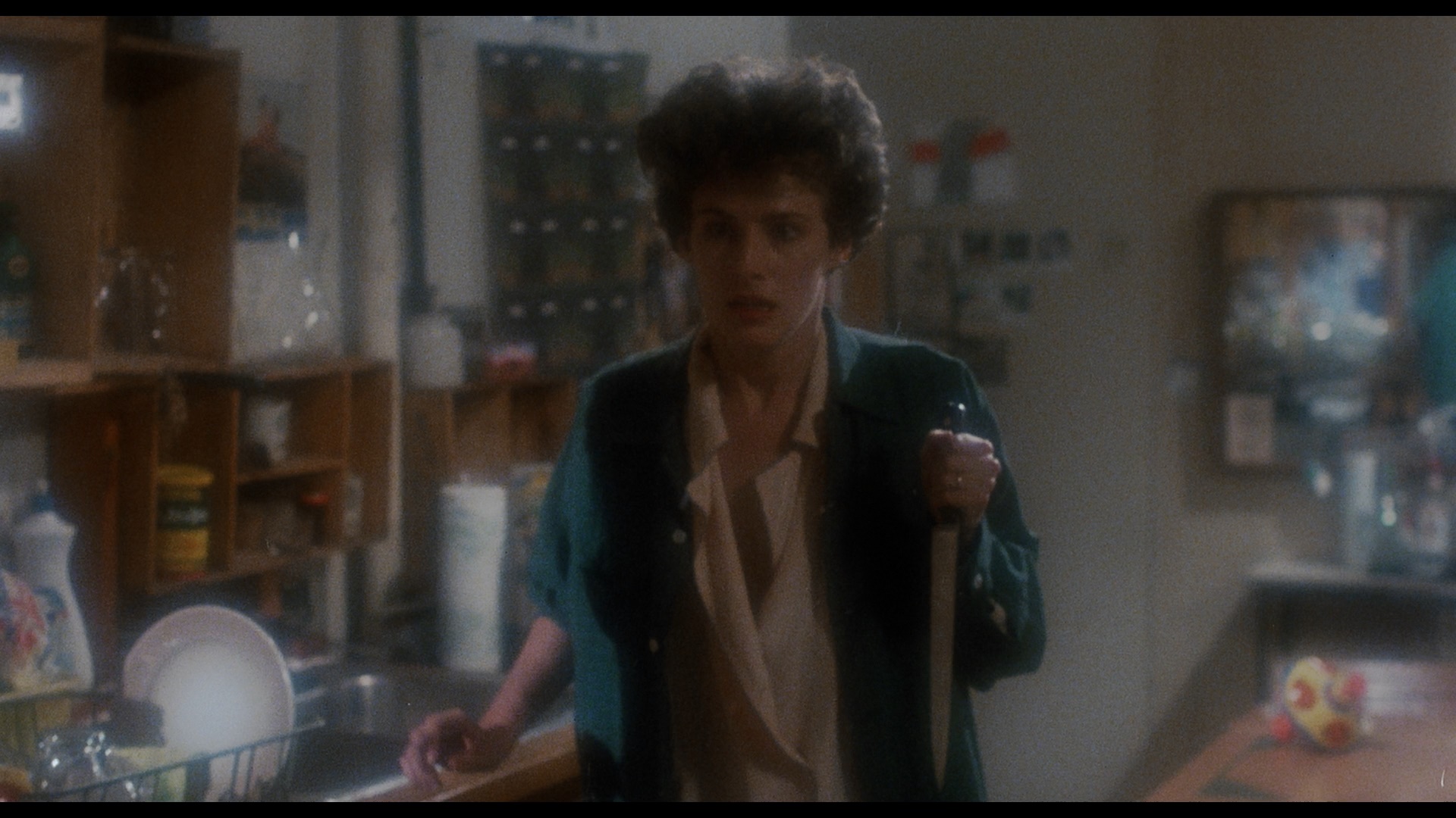 more information on both sides compared to both framing options on the MGM disc and looks nicely framed throughout, with more vertical information visible than the earlier 1.85:1 option as well. (See below for a few comparisons.) The DTS-HD MA English 2.0 mono track also sounds good considering the very modest nature of the original source, which features some pretty sloppy sound editing at times. Optional English SDH subtitles are also provided. As for extras, in "A True Artist" (7m46s), Carlisle speaks over video conferencing (due to the current pandemic of course) about coming on this film just after his biggest cult hit thanks to an acting class, the extremely low budget, the way Cohen brought out a connection with her young costar that wasn't possible on the set, and her more ongoing pursuits as an artist. Then "A Shadow in the City" (9m13s) is essentially the full Cohen interview conducted for the documentary King Cohen in which the now deceased filmmaker discusses the making of this film as a simple project back in New York as a two-picture deal with Hemdale, including extensive location coverage that required him to memorably jump in front of the camera during a crowd scene that threatened to get out of control. A brief promotional gallery (38s) is also included; as with Vinegar Syndrome's other MGM releases, the trailer is absent here but can be found on the older DVD if you're a completist.