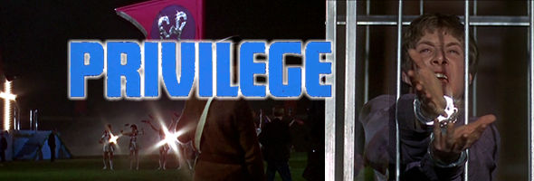 Watkins' Privilege was the first theatrical feature from the controversial director of The War Game, the infamous banned TV post-nuke "documentary." With this film, Watkins turned his eye to a story of Britain "in the near future" where a pop idol, Steven Shorter (Jones, former lead singer of Manfred Mann), holds a powerful sway over the population thanks to his elaborate stage shows which feature him hauled out of a burlap prisoner's sack and into a cell where stage police beat him savagely while he sings songs pleading for freedom. Naturally, the teenagers eat it all up, much to the delight of his hyper-efficient PR team which has managed to turn his persona into a massive commercial industry manipulated by both church and single-party state. The game starts to change when pretty painter Vanessa (real-life supermodel Shrimpton) is brought in to create his portrait only to fall in love with the battered, bruised, manufactured idol, whose misery mounts when his handlers make him the centerpiece of a nocturnal festival honoring a country-wide Christianity week meant to covert over all of his susceptible young fans.