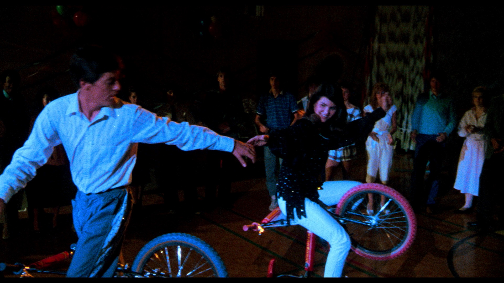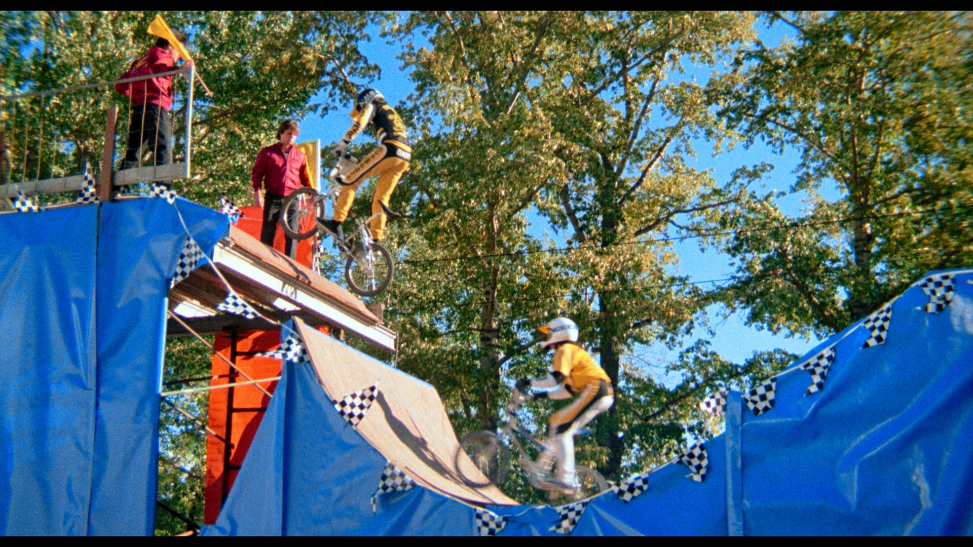 their second offering after Tammy and the T-Rex. The new 4K scan from the 35mm original camera negative looks great with some outrageously saturated reds and blues that threaten to punch into your eyeballs at times. The late '80s film stock isn't exactly the prettiest thing in the world and the film now looks a bit darker than it has on past video editions and cable; fans should be very happy with the upgrade for sure. Only the Blu-ray was provided for review (and frame grabs), but presumably the UHD will look even better. A DTS-HD MA English 5.1 track is included (with optional English SDH subtitles) that goes nuts filling up the front and rear speakers with some extreme separation at times, including heavy surround use during the songs. For purists the original 2.0 stereo mix is also included, albeit only in lossy Dolby Digital. No less than three audio commentaries are included: a new one with Shire and her son (and Rad champion) Robert Schwartzman; another new one with Allen; and the archival track with Allen, Conner, writer Sam Bernard, and BMX riders Eddie Fiola, Martin Aparijo, Jose Yanez, and Jeremy Moser recorded for the DVD edition. As you'd expect they all offer something very different including notes on Jack Schwartzman's involvement, the distribution by TriStar, the location shooting in Alberta, the logistics of capturing all those bike daredevils in action, the casting process, the variety of pick-up shots captured around California, the various pratfalls and early morning shoots on the set, and lots more. The Allen solo track has the most dead air and can tend to lapse into basic recitation at times, but he also has quite a few funny observations (some repeated from his other track like that opening unicorn gag) and clearly