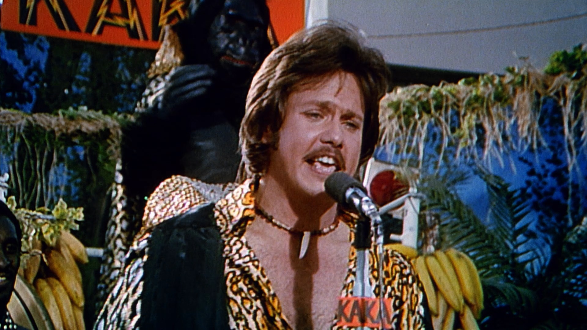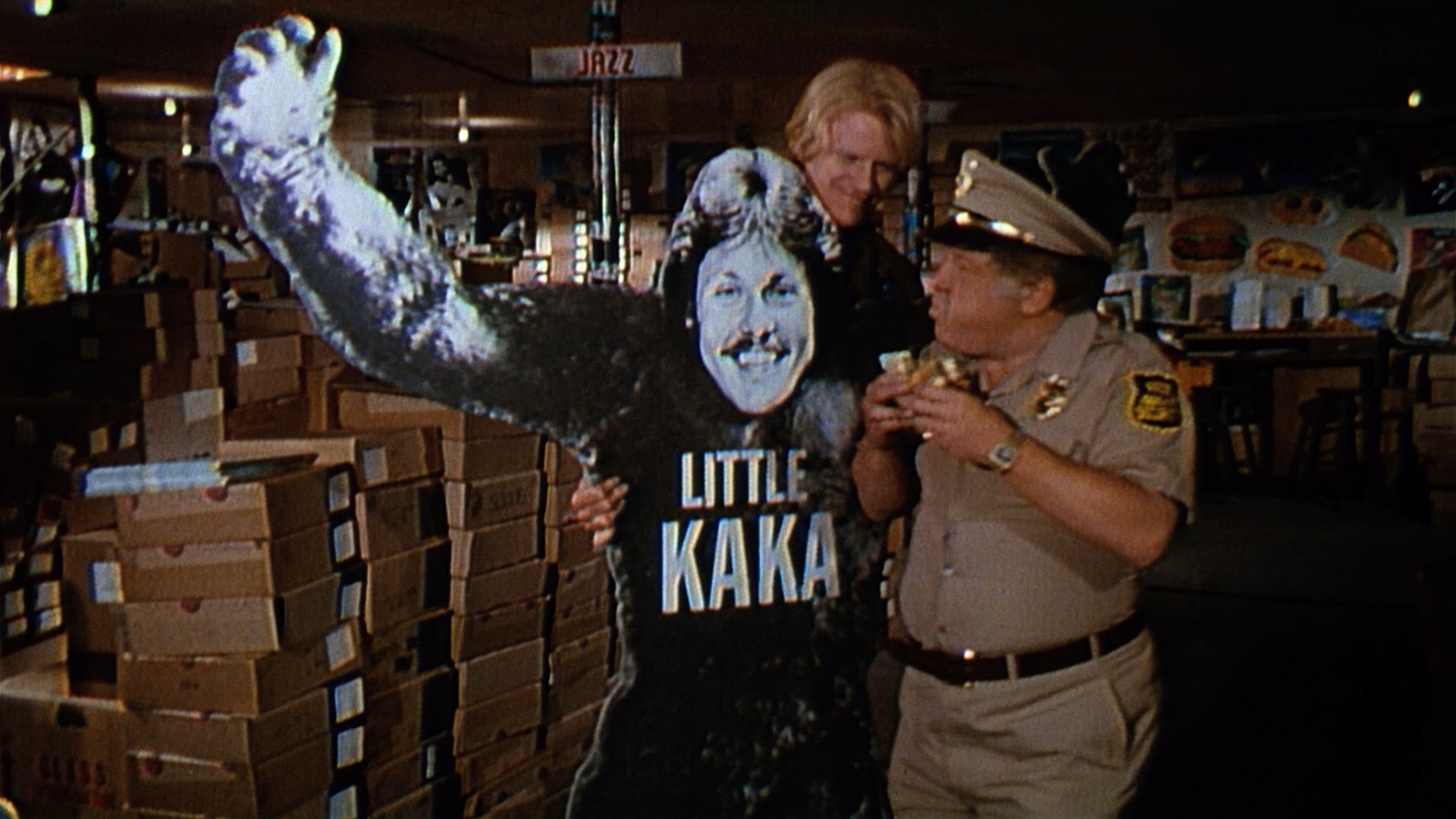 boy Pokey (Begley Jr.) hatches his own low-scale heist. The strand of a real plot involves the impending "Radio & TV Talent Contest" being thrown by hot-shot DJ Gordon Kong (novelty performer and real-life disc jockey Dees of "Disco Duck" fame), who puts on a hammy gorilla persona, of course, with the staff taking part along with high-voltage celebrities like Kinky Friedman and Gallagher.