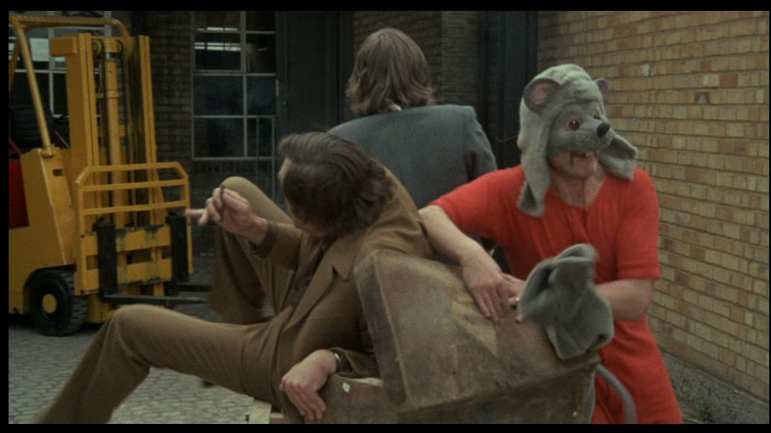 "Somewhere in England," the lovely and wealthy Utta Armitage (The Legend of the Seven Golden Vampires' Ege) is giving a press interview about some recent circumstances that have put her in the limelight along with her industrialist husband, Jeffrey (UK TV vet Sinden). Mr. Armitage has two problems: he thinks his wife's cheating on him, and several suspicious international powers are keen to get their hands on a new nerve gas he's cooked up that causes temporarily paralysis. "Famous secret agent" Madam Greenfly (You Only Live Twice's Chin) has a squad of craft Japanese spies working on prying the formula away, not to mention some Arabs who are into enslaving scantily-clad British showgirls. To solve both challenges, it's up to the detectives at Upton Security, whose head, Major Upton (The Bed Sitting Room's Fraser), sends the girl-shy Hobbs (Beckinsale) to, uh, get to the bottom of Mrs. Armitage, while the easily corrupted Hamilton (Booth) and Miles (Briers) wind up taking bribes from Greenfly on their way to protecting the nerve gas. Given the title and basic subject matter, you'd expect this to be a T&A-packed snickering sex comedy about randy young lad detectives getting into all sorts of naughty trouble. Well, there are plenty of innuendos, but this is actually less raunchy than your average Benny Hill TV episode. Ege shows off her Thanks to the strength of its cast and reasonable nostalgia value, Rentadick has stayed in circulation on video regularly in the UK (including a 2007 DVD from Network) but remains almost completely unknown in America. The 2013 Scorpion release will be a first time experience for many viewers, who should get a kick out of its broad slapstick comedy and the ridiculous barrage of non-PC treatment of minorities, who are so exaggerated here one has to wonder whether anyone was offended back in '72. The picture quality looks quite strong throughout, with lots of appropriately garish colors and workable compositions framed at about 1.78:1 with slight windowboxing on the top, bottom, and left sides. (Presumably this was an anamorphic transfer originally created by Rank.) You don't really get any extras directly related to the film, but it is presented as part of the label's "Kat Skratch Action Cinema" line with hostess Katarina Leigh Waters pulling double duty here both as herself, firing off the usual rounds of trivia about the cast and crew, and her deranged French twin sister, who hijacks the wraparounds while dressed up in Sherlock Holmes drag. Stay tuned after the film for a particularly bizarre (and funny) payoff for fans of her other "Nightmare Theater" line, too. Also included are additional trailers for other Scorpion titles like Quest for Love, Kill and Kill Again, Tomboy, The Pom Pom Girls, Joysticks, Alley Cat, Voyager, and The Internecine Project.
