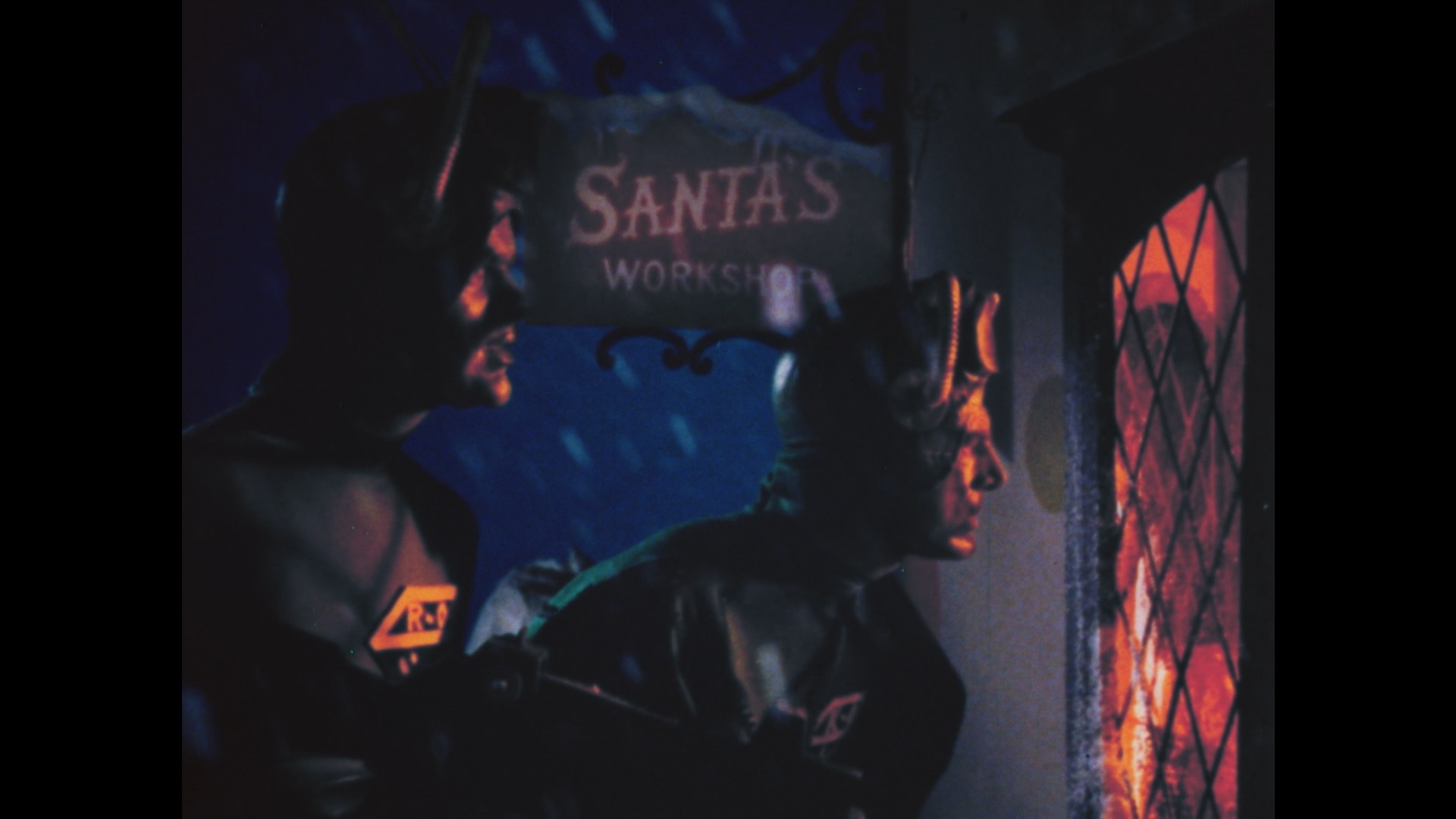 The first Blu-ray of this infamous stocking stuffer came along from Kino Lorber in 2013, with a bumpy initial pressing pulled after it turned out a master was used with 20 minutes missing. The corrected version didn't stay around for long and now goes for a hefty price, though the DVD option is still available. Extras include a newly created trailer, a stills gallery, and a "Santa's Cool Holiday Film Festival" (46m17s) reel of holiday-themed classic cartoons, commercials, and short subjects. In 2024, AGFA and Something Weird Video teamed up for a new Blu-ray edition released as Santa Claus Conquers the Martians and Other Holiday Hallucinations, this time presenting a "roadshow" version of the film from SWV's 16mm print. The film is preceded by six minutes of newly-scanned Christmas theatrical bumpers including a great 1971 one and a K. Gordon Murray compilation feature, Santa's Giant Film Festival of the Brothers Grimm. The main feature is also interrupted by an amusing intermission featuring a certain retired Oscar winner doing a Christmas Seals pitch. Transfer-wise it's quite different from the Kino Lorber in terms of color timing, as you can see from the comparison below; this
