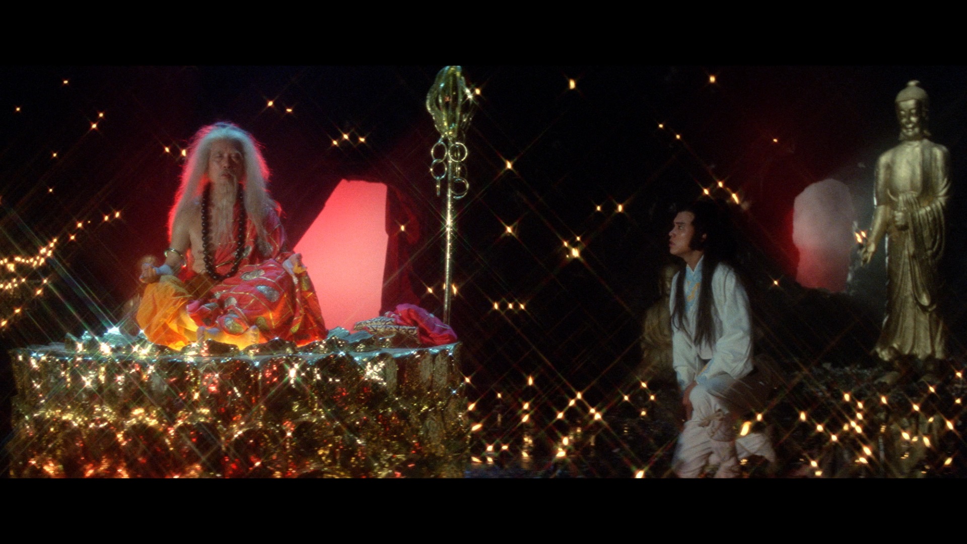 trailer.Our final double feature on disc eight is devoted to two more niche films, albeit ones with a deserved cult following. The insane Buddha's Palm from 1982 has been on a lot of Blu-ray wish lists, and it doesn't disappoint here with the new 2K presentation blazing as spectacularly as you might hope. An obvious stepping stone in the development of frenetic, effects-driven action fantasies that flourished under the guidance of names like Tsui Hark, this one is loaded with fantastic imagery and lasers and monsters and... well, you name it. Trying to write a linear synopsis for this is pointless, but a frenetic prologue establishes the mystical secret of the title method passed on after the death of a powerful mystic and its ramifications across the supernatural practitioners of the land. After that a young man named Lung (Derek Yee) gets into a furious fight with his ex-girlfriend's current beau, a ruthless ruffian who ends up chucking him off a cliff. Lung is saved by a flying golden dog dragon who takes him to a massive cave inhabited by Flaming Cloud Devil (Alex Man), who schools him in becoming his accomplice in unleashing flaming, flowing, exploding payback.