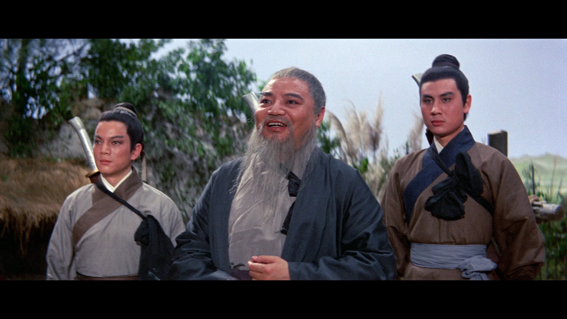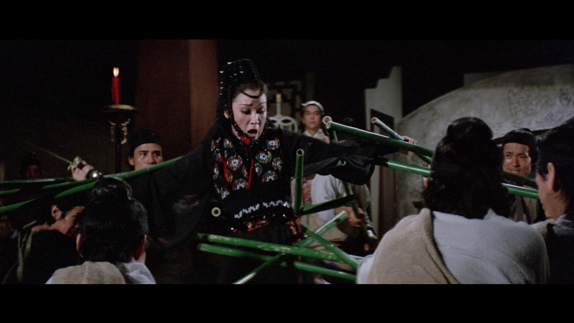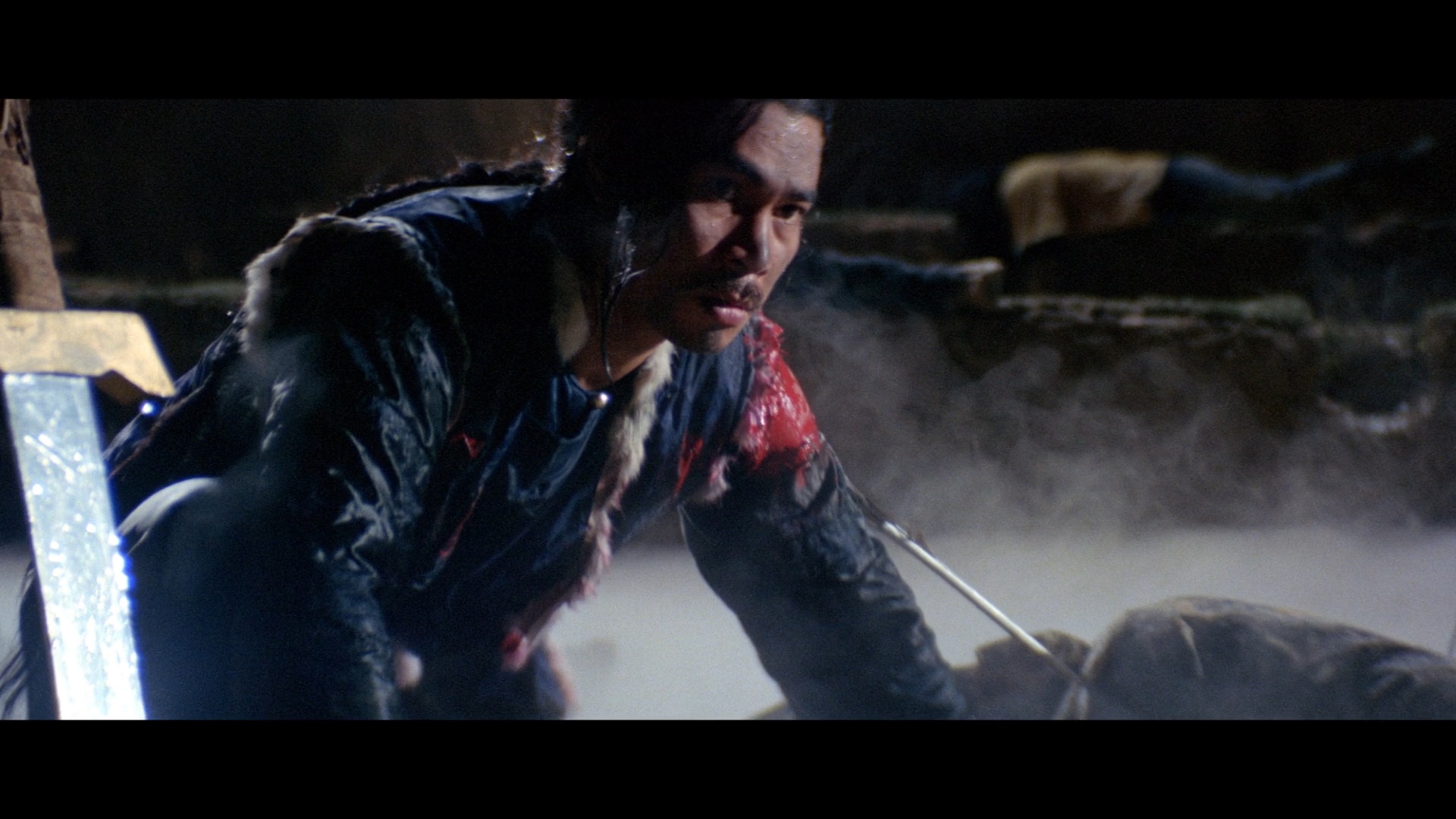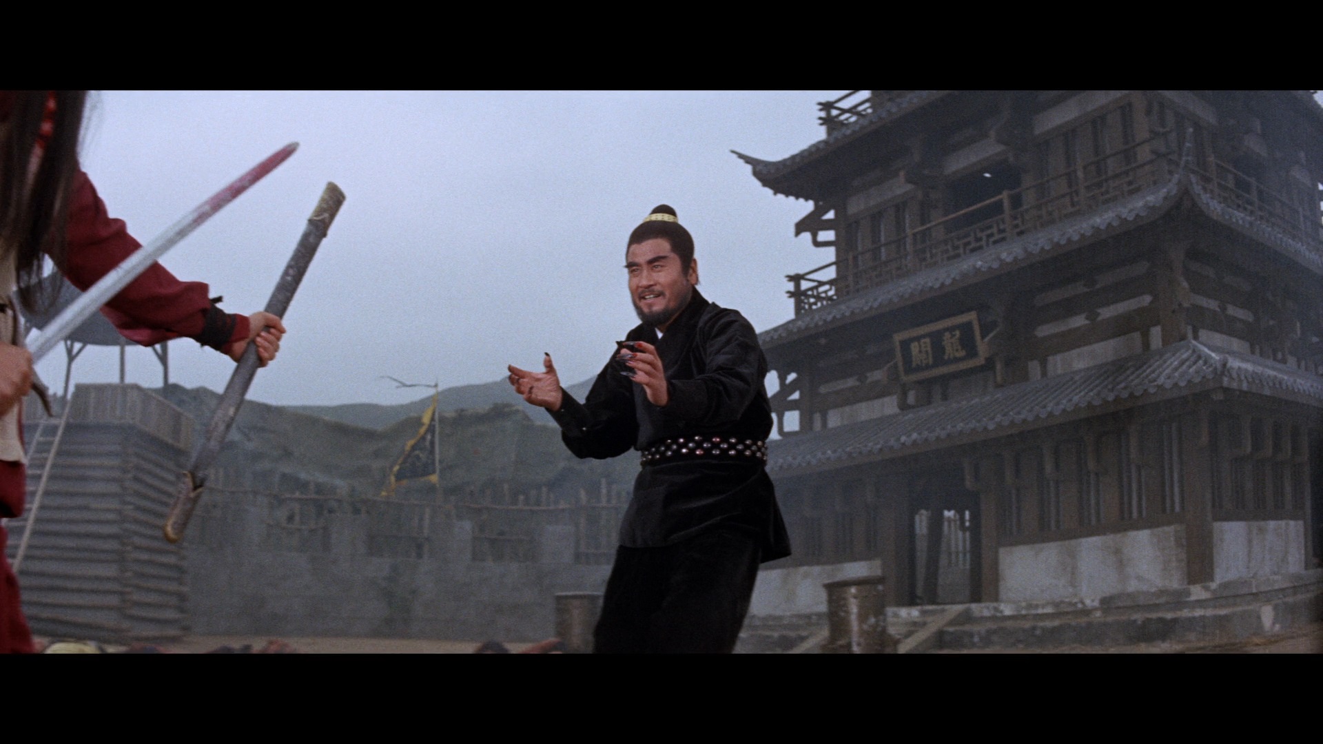 the long interim when the studio's films were off the market (including multiple ones under the very misleading Lightning Kung Fu), this hit Hong Kong DVD and moved on to Blu-ray in both Germany and the U.K., the latter from 88 Films in 2017 featuring English and Mandarin tracks, a Bey Logan commentary, a trailer, and liner notes by Calum Waddell. Here you get another new 2K restoration that improves on prior releases and really shines during the night scenes, which don't have that flat, gray look anymore. The Mandarin and English tracks are also here with better English subtitles, and cementing this film's status as one of the most important in the set, you get three-- three!-- audio commentaries this time, all solo ones by Tony Rayns, Frank Djeng, and Brian Bankston. They obviously all know the material very well and cover all the bases here including the director's background, the shift in wuxia films by this point, the dynamic visual shift here including cross-genre influences, the moral code of our protagonist versus the prior films, trivia about the cast, and the fact that this was a South Korean co-production (including significant location shooting there and multiple cast members). Speaking of which, the disc also includes all of the additional and alternate footage used for the film's radically different South Korean release (34m15s) from the best source, a cropped SD tape master. It's quite different including a very contrasting angle on the main character, but more on that in a moment. Also here are alternate