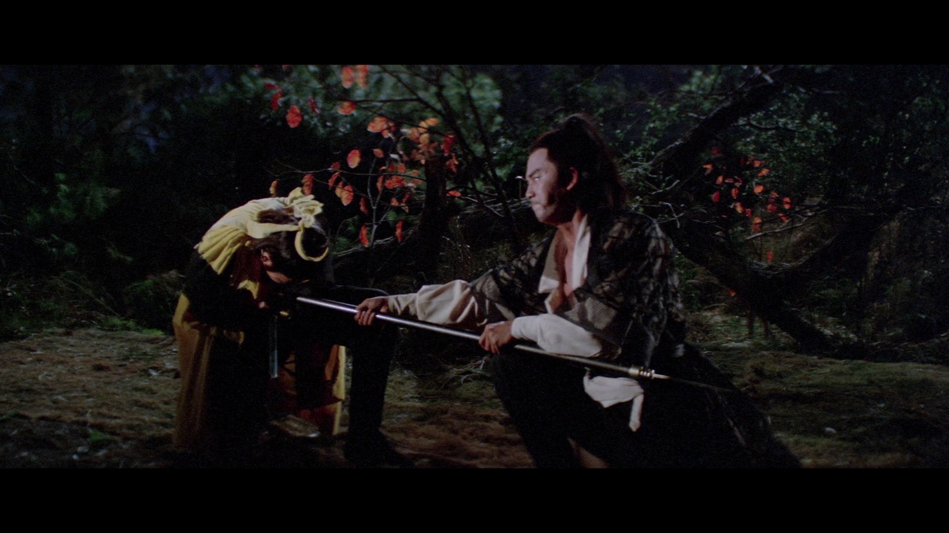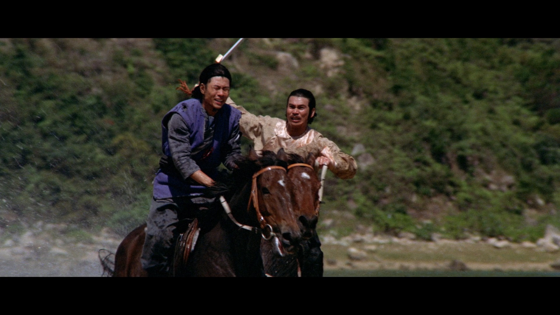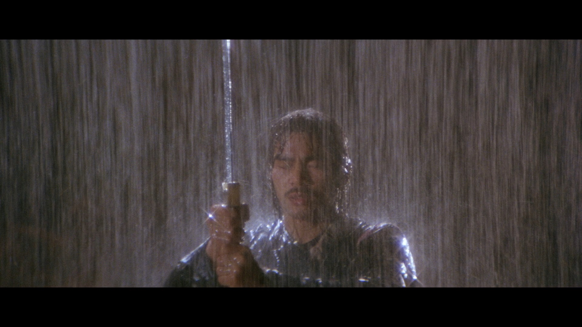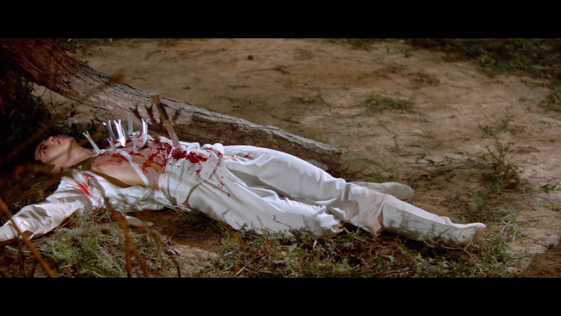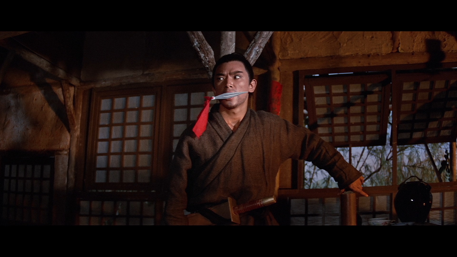 the long interim when the studio's films were off the market (including multiple ones under the very misleading Lightning Kung Fu), this hit Hong Kong DVD and moved on to Blu-ray in both Germany and the U.K., the latter from 88 Films in 2017 featuring English and Mandarin tracks, a Bey Logan commentary, a trailer, and liner notes by Calum Waddell. Here you get another new 2K restoration that improves on prior releases and really shines during the night scenes, which don't have that flat, gray look anymore. The Mandarin and English tracks are also here with better English subtitles, and cementing this film's status as one of the most important in the set, you get three-- three!-- audio commentaries this time, all solo ones by Tony Rayns, Frank Djeng, and Brian Bankston. They obviously all know the material very well and cover all the bases here including the director's background, the shift in wuxia films by this point, the dynamic visual shift here including cross-genre influences, the moral code of our protagonist versus the prior films, trivia about the cast, and the fact that this was a South Korean co-production (including significant location shooting there and multiple cast members). Speaking of which, the disc also includes all of the additional and alternate footage used for the film's radically different South Korean release (34m15s) from the best source, a cropped SD tape master. It's quite different including a very contrasting angle on the main character, but more on that in a moment. Also here are alternate