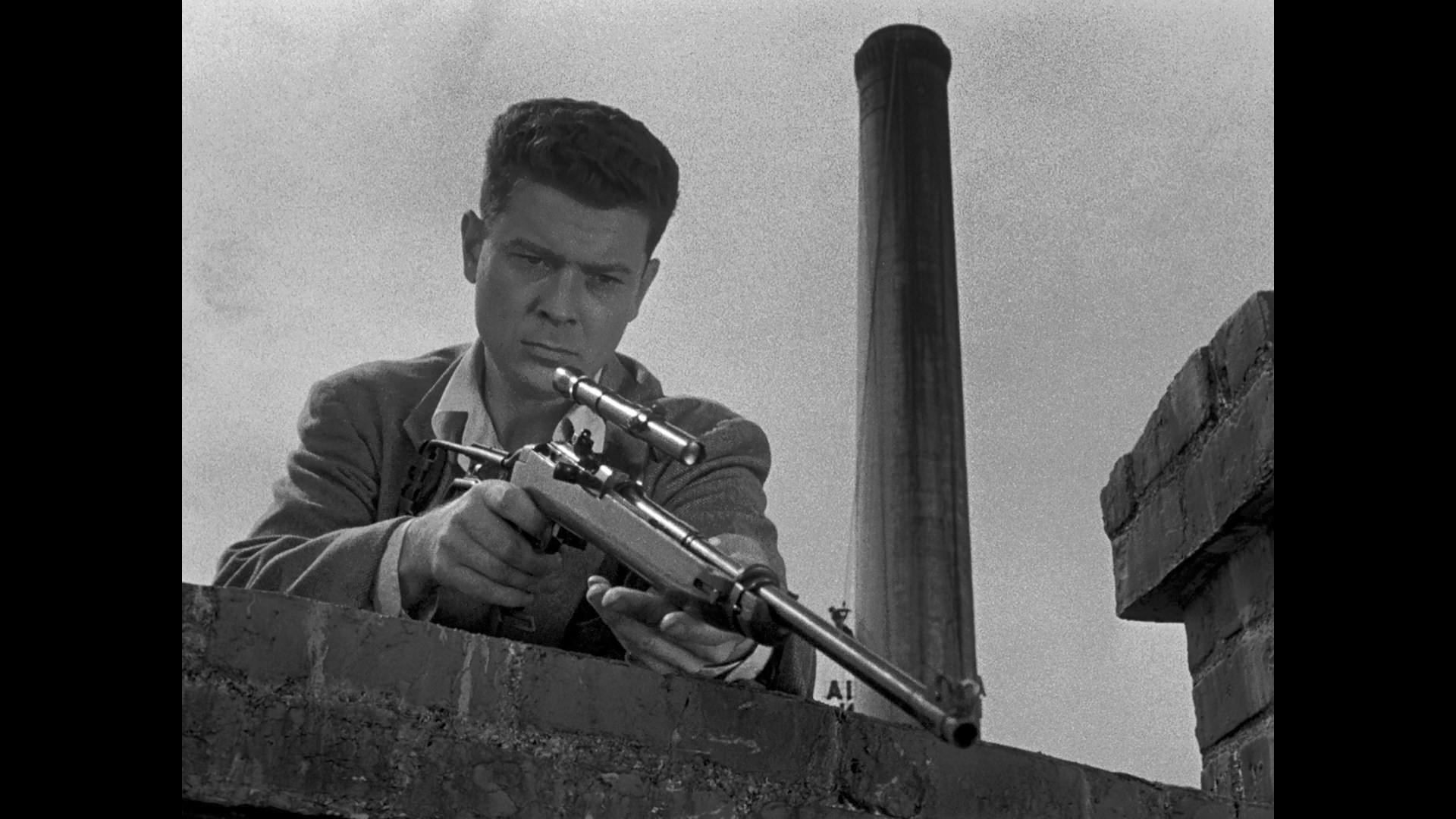 Film number five is one that garnered a hefty amount of buzz in the film community when it first hit DVD back in 2009 as part of the Columbia Pictures Film Noir Classics 1 box. Made by The Stanley Kramer Company and sporting an opening disclaimer that this is a serious look at the "story of a man whose enemy was womankind," this was part of a run of very solid genre films from director Edward Dmytryk that are often overshadowed by the one big dramatic heavy hitter from that period, The Caine Mutiny, as well as his own controversial role in the HUAC hearings as one of the Hollywood Ten after which this film marked his comeback of sorts. What we have here is essentially the granddaddy of the sniper attack movie, something that would become more familiar later with films like Targets and TV's The Deadly Tower (both inspired to different degrees by Charles Whitman's 1966 shooting rampage in Austin, Texas). In fact, Harry Novak even engineered a scuzzy semi-remake of this film as Zero In and Scream, which would make for a very weird and queasy double feature.