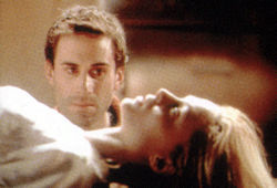 Based on the radically different novel by Sean French, the story is told mostly in flashback by Alice (Heather Graham), a CD-Rom designer (yes, you read that correctly) telling police about her troubled relationship with Adam (Joseph Fiennes), a heroic mountain climber. A naive American adfrift in London, she first meets Adam at a city crosswalk and moments after is having passionate, anonymous sex in his apartment. After a second tryst, she dumps her devoted boyfriend and goes off to Adam's, which it turns out is really the residence of his sister and fellow climber, Deborah (Natasha McElhone). After spending an evening wandering in the snow, Alice finally tracks down her true love. Soon after her purse gets snatched on the street, and a stalking Adam chases the criminal down, smashes his face to ribbons against a glass telephone booth, and proposes marriage to Alice on the spot while the bloody robber twitches in agony at their feet. (Yes, this really happens.)