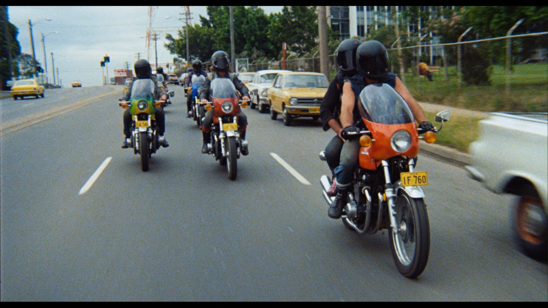 tests (8m33s), the trailer, and a slideshow of production stills with Harbutt commentary (21m19s). In 2021, Umbrella bowed the film on Australian Blu-ray featuring all of those extras along with a huge heaping of extended interviews from Mark Hartley's Not Quite Hollywood (125m37s) with Harbutt, Shorter, Rebecca Gilling, Roger Ward, editor Ian Barry, and executive producer David Hannay sharing tons of anecdotes from the shoot involving arrests, makeup mishaps, the real bikers, the scripting process, and more. In a very welcome gesture, it also features the deleted and extended scenes (37m57s) from the longer theatrical cut including more skinny-dipping, more riding, more chatting, and more funeral-ing. It's easy to see why the director wanted to pare this material down for pacing reasons, but the presence of this material here as a bonus is great to have. You also get a brief Quentin Tarantino appreciation for the film. In 2022, Severin released its own region-free Blu-ray edition featuring the same excellent HD scan (approved by the director just before his death) and all of the extras from the its earlier release and the Umbrella edition (except for the Tarantino bit, which is no significant loss). The DTS-HD MA English 2.0 mono track is in excellent shape as well and features optional English subtitles. The Severin Blu-ray also comes with a 15-track CD soundtrack, featuring the fuzz-laden score by Billy Green in all its glory and clocking in at 44m47s.