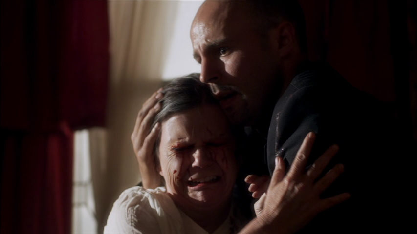 Things start off with a bang as we meet little Jimmy Morgan (soap actor LoPorto, delivering a highly effective performance) locked inside a cage at the behest of his panicked, religious mother (Tomaselli regular Sanford). Jimmy's older brother, a priest, has been brought in to help, but the ordeal instead leaves mom blind with her eye sockets bleeding. From there we jump back through time to find out how they got there, with the sadistic Jimmy getting his face horribly burned