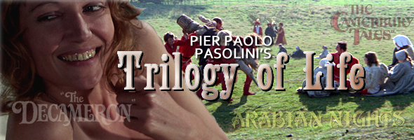 Fortunately both discs address the major sticking issue for many viewers, the language track. Many of the primary players are familiar faces from British film and TV, with the hammy Griffith, delicate Chaplin, and cult favorite Runacre (The Creeping Flesh) faring best. All of the British actors performed their lines in English and used their own voices for the dub (including a small role for Robin Askwith in his exploitation prime before his Confessions series of sex comedies, here performing perhaps the longest on-camera bladder relief ever captured on film), so for some this is the most legitimate version; however, the stilted delivery of Chaucer's lines from nearly everyone else sounds canned and awkward, robbing the film of much of its spontaneity and warmth. The Italian track was never released theatrically in America and is rarely encountered elsewhere, so its inclusion here is a fascinating option and in many respects makes for a more enjoyable, smooth viewing experience. The Italian voice performances sound more energetic and natural, while the option to read the lines actually helps some of the jokes play better. Also, since in the final tally the two best performances also comes from Italians (Betti and Cinci), their own Italian vocal tracks can't help to boost the proceedings. Ultimately viewers should sample both options to see which one they prefer, but at least now it's easy to compare in one simple package. The BFI again has the option to play the English version with the original UA credits and, in a nice touch, alternates to the English-language inserts when Chaucer is seen writing his stories. On the other hand, the Criterion segregates these alternate bits of footage as a bonus feature. The biggest extra on the BFI is "Pasolini and the Italian Genre Film," a new featurette by David Gregory and Alberto Farina examining the director's influence on horror, sexploitation and comedy films. This would have probably made more sense on the Decameron disc given that film's more prevalent influence, but either way it's nice to have thanks to interviews with writers and producers who worked with Pasolini (and sometimes imitated him) including Gabriele Crisanti, Paolo Bianchini and Alfredo Bini. You also get a very saucy theatrical trailer and a booklet containing liners by the same participants from the prior disc, here making a case for its wholly unique take on English views of sex and the church. Given that this film added a non-Chaucer scene of a gay man unable to buy his way out of condemnation being roasted alive in an outdoor contraption surrounded by leering buffoons, it's safe to say Pasolini was serious in his jabs against organized religion. The Criterion has two variations on the European trailers and the American one plus a new 14-minute video interview with Pasolini biographer Sam Rohdie (who sheds some light on the director's intentions with this film), a fascinating 48-minute dissection of it again made in Italy in 2006 called "Pasolini and the Secret Humiliation of Chaucer" (which also helps parse out some of the religious material in the film), a brief new 9-minute interview with legendary composer Ennio Morricone (who worked on all three films providing subdued, period-style music and also composed Pasolini's incendiary last film, Salo), and a new 18-minute interview with production designer Dante Ferretti, whose achievements on these films (especially the third one, which we'll get to in a second) are impressive indeed.