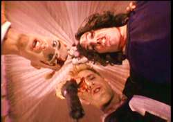 Meanwhile Juliet (Jensen) is at the mercy of her vile father, Cappy (Shaun, actually actor William Beckwith under a pseudonym to dodge union wrath), who gets off on confining her in a giant glass cage for activites thankfully left mostly to the viewer's imagination. Naturally our two maladjusted teens meet at a costume party and fall madly in love, with Tromeo later paying her a nocturnal visit in her prison where they make the beast with two backs under the gaze of Juliet's cook and sometimes lesbian lover (Rochon). Soon all hell breaks loose as skulls are repeatedly punctured with sharp implements, one character reveals a twisted genectic secret with a bovine twist, and numerous others get tattoos and body piercings, all leading to a seriously sick climax that tosses Shakespeare's resolution out the window in favor of something far more perverse.