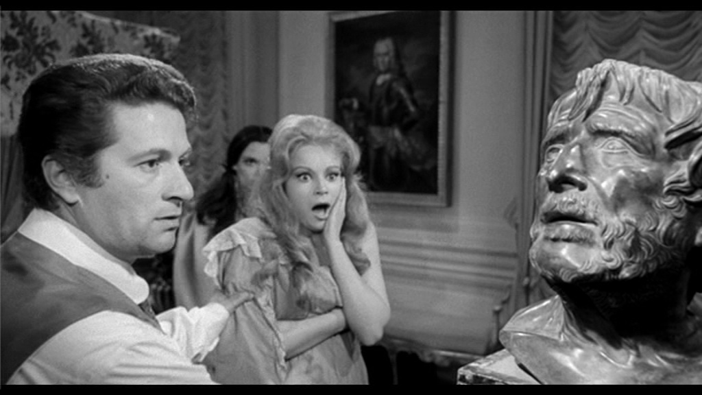 shades of ruby red looking particularly nice. Two reels display a thin line of orange-colored damage popping in and out a few times, most egregiously around the 36-minute mark. The English track, which works pretty well since that's what almost everyone spoke even if they were looped later, is presented in DTS-HD MA 2.0 mono and sounds okay as well. The film can be played in a "Katarina's Bucket List" mode with hostess Katarina Leigh Waters as both herself and her twin (of course), trying to find directions through the woods and taking possession of a really big ring before supplying the usual rundown of the major players in front of and behind the camera. She also has to deal with diabolical foodstuff, and that errant Japanese footage turns up tucked away at the end as well.