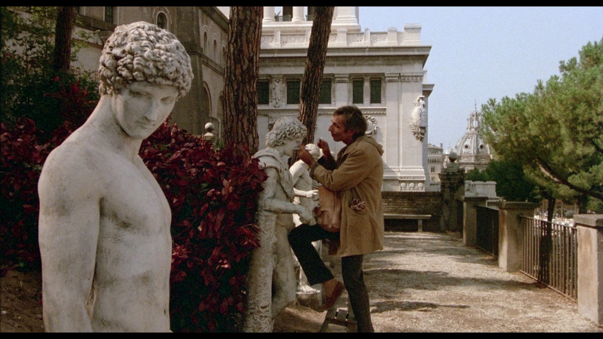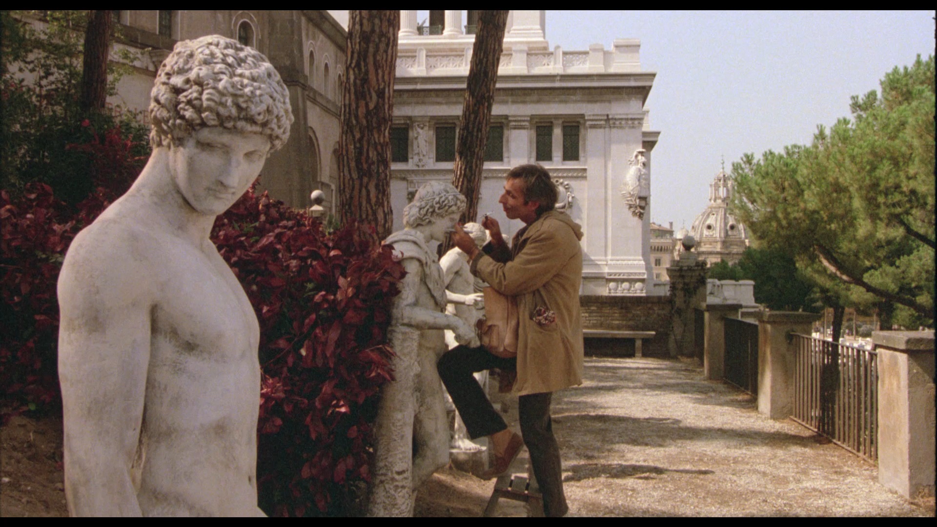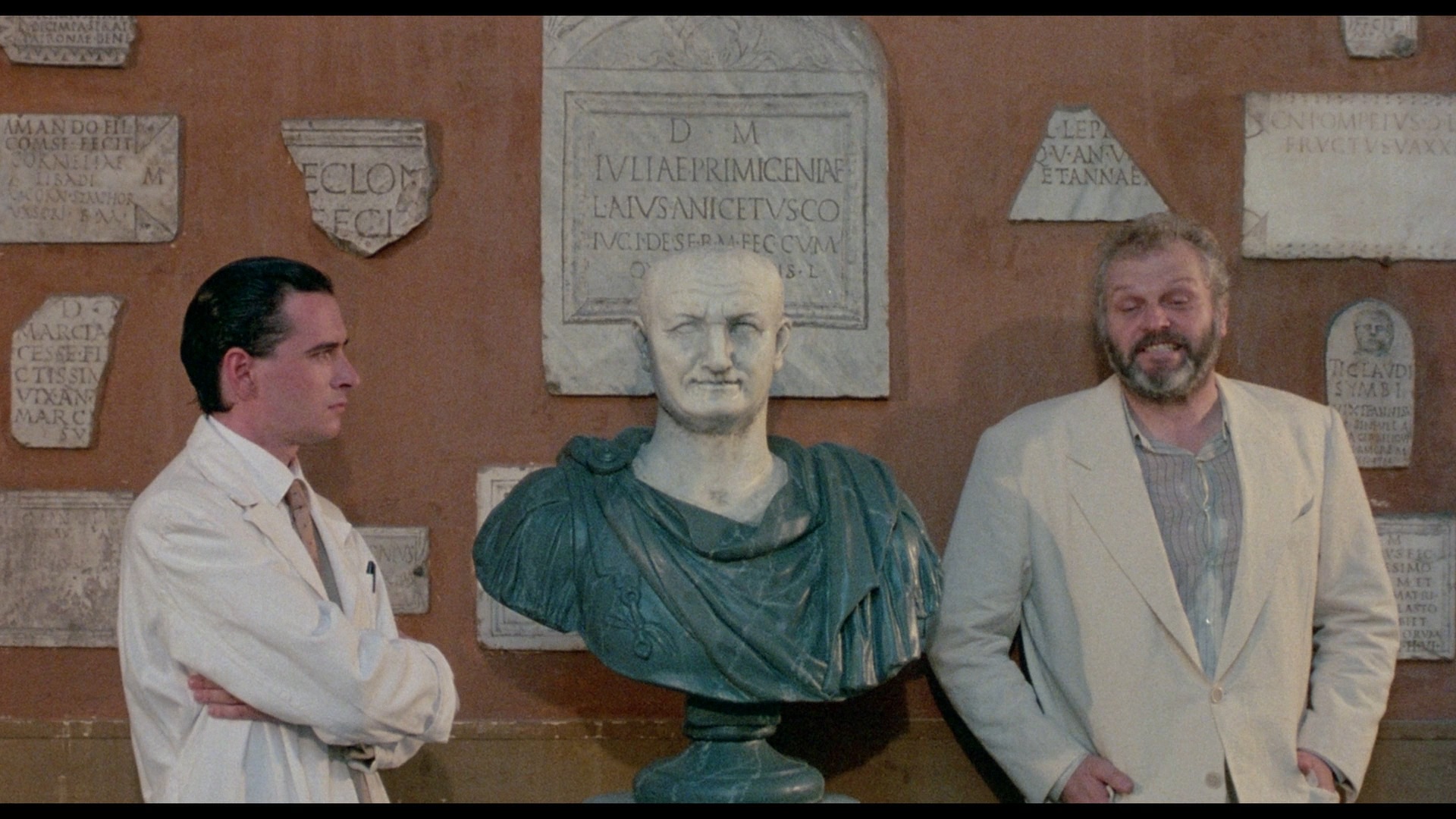 2K scan and restoration from the original 35mm camera negative. The prior HD presentation was already excellent so the difference here isn't tremendous, but the grain is managed better here and looks more natural while reds are more controlled and don't glow in a few spots like they do on the BFI (see fifth comparison grab below). The DTS-HD MA 2.0 English stereo track sounds as good as it always has with fine separation, and optional English SDH subtitles are provided. A new commentary track with Eugenio Ercolani and Greenaway obsessionist Tony Strauss covers everything you could possibly want to know about the production including Greenaway's reasons for distancing himself from it in later years, the numerous ties to his other films, the Italian production crew involved, the themes of architecture and the body, the merits of the score, and tons more. In "Stately Progress" (18m3s), still-busy editor John Wilson chats about his career path that led to the COI at the same time with Greenaway, the move to features with Draughtsman, working out the themes to this film upon seeing the footage which he couldn't see until it was all finished, the role of fine arts and especially drawing in this film and their others, and his overall working process with Greenaway which continued through Cook. "Caput Mundi" (28m31s) is an intriguing interview with architect Gianpaolo Ercolani (and some photogenic cats) about Greenaway's evolving relationship with Rome and its surroundings, his own introduction to Greenaway via Draughtsman, the boldness of casting Dennehy, the conceptual trademarks of Étienne-Louis Boullée's architecture, the heavy number of pick-up close shots done later in England, the doctrines behind the discipline, and the role of signature buildings here like the Pantheon. An insert booklet features an essay by Scout Tafoya, "The Cenotaph and Cake," placing this film in context with Greenaway's oft-stated theories about cinema and the ways one of its central architectural images reflects on the larger purpose of the story.