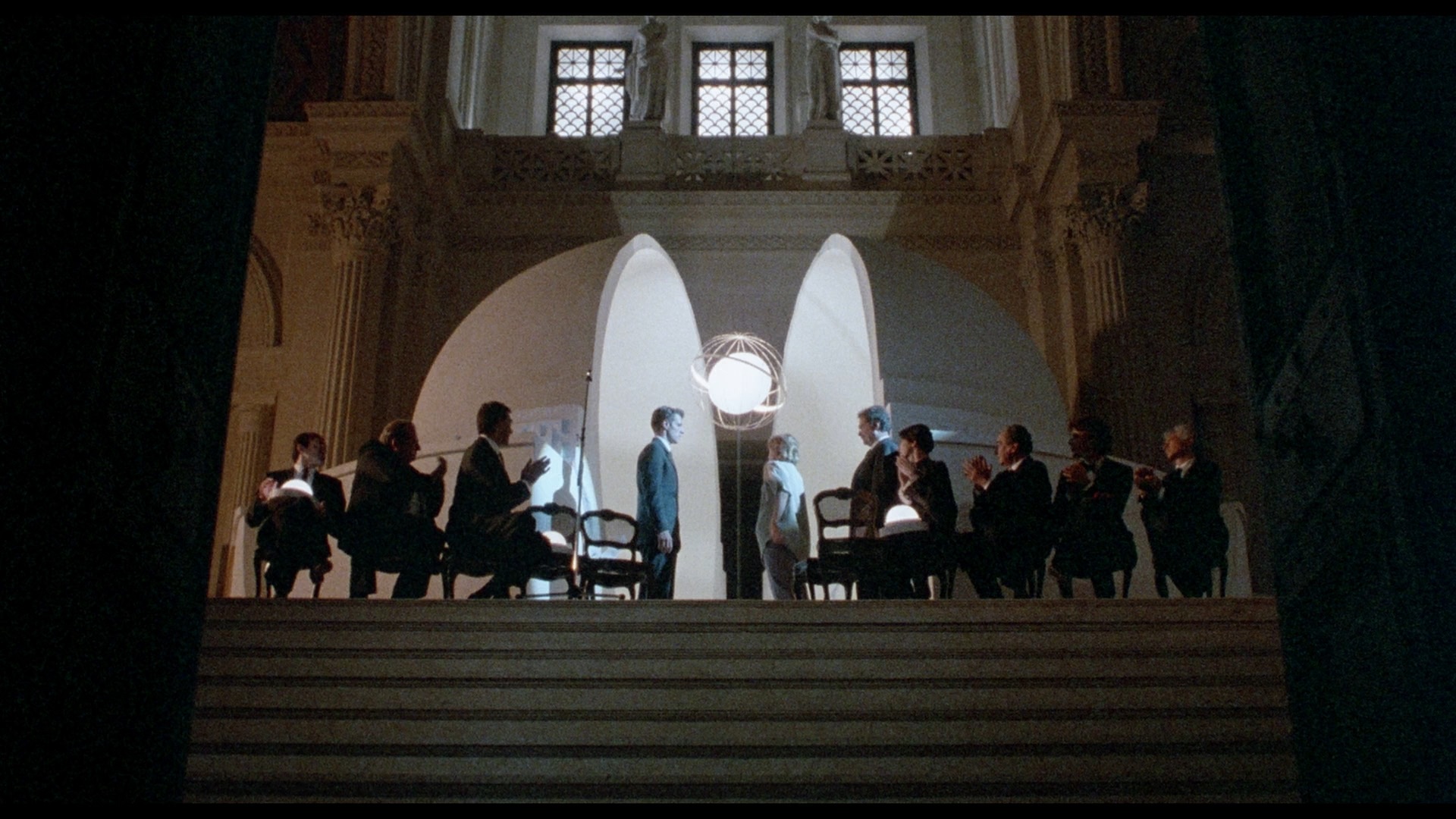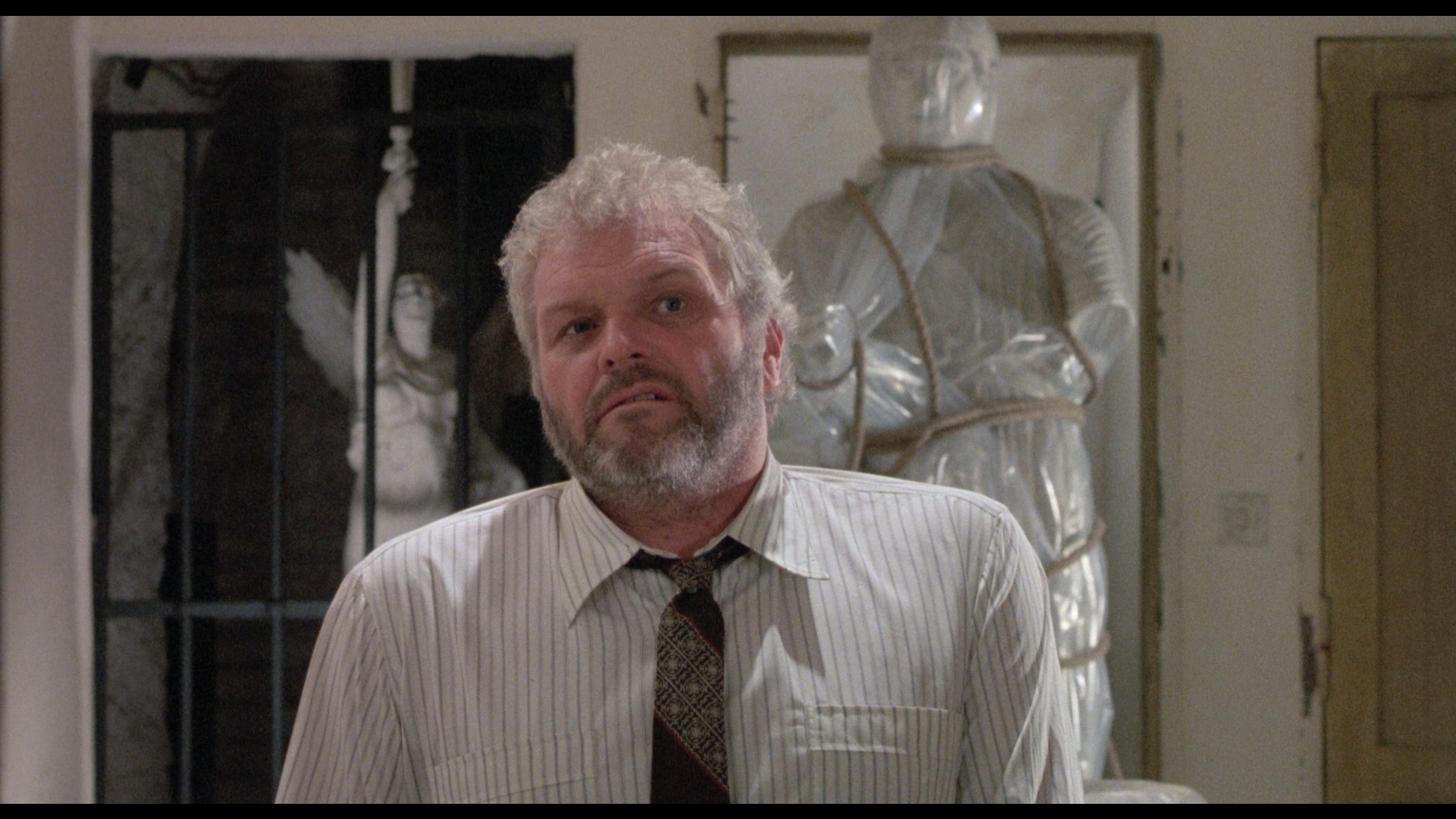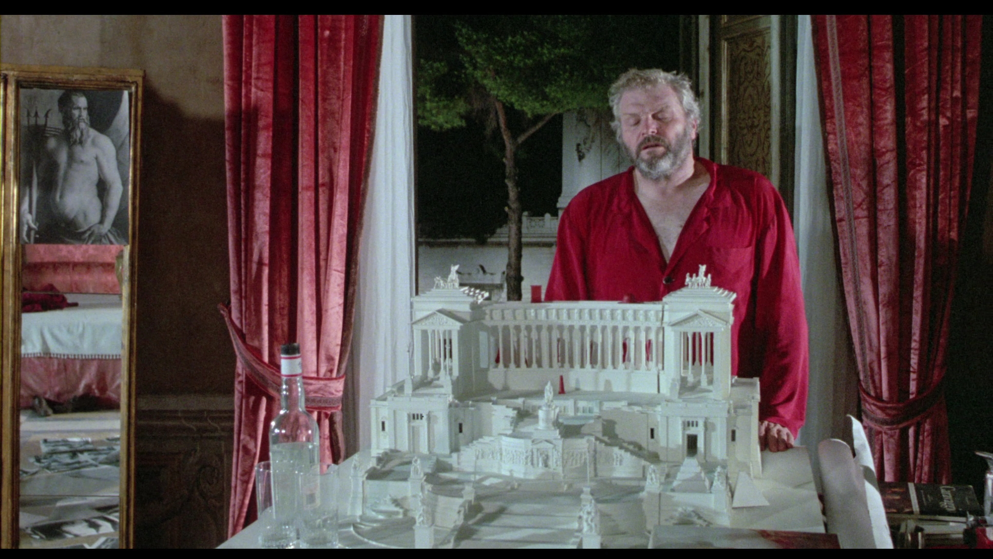 2K scan and restoration from the original 35mm camera negative. The prior HD presentation was already excellent so the difference here isn't tremendous, but the grain is managed better here and looks more natural while reds are more controlled and don't glow in a few spots like they do on the BFI (see fifth comparison grab below). The DTS-HD MA 2.0 English stereo track sounds as good as it always has with fine separation, and optional English SDH subtitles are provided. A new commentary track with Eugenio Ercolani and Greenaway obsessionist Tony Strauss covers everything you could possibly want to know about the production including Greenaway's reasons for distancing himself from it in later years, the numerous ties to his other films, the Italian production crew involved, the themes of architecture and the body, the merits of the score, and tons more. In "Stately Progress" (18m3s), still-busy editor John Wilson chats about his career path that led to the COI at the same time with Greenaway, the move to features with Draughtsman, working out the themes to this film upon seeing the footage which he couldn't see until it was all finished, the role of fine arts and especially drawing in this film and their others, and his overall working process with Greenaway which continued through Cook. "Caput Mundi" (28m31s) is an intriguing interview with architect Gianpaolo Ercolani (and some photogenic cats) about Greenaway's evolving relationship with Rome and its surroundings, his own introduction to Greenaway via Draughtsman, the boldness of casting Dennehy, the conceptual trademarks of Étienne-Louis Boullée's architecture, the heavy number of pick-up close shots done later in England, the doctrines behind the discipline, and the role of signature buildings here like the Pantheon. An insert booklet features an essay by Scout Tafoya, "The Cenotaph and Cake," placing this film in context with Greenaway's oft-stated theories about cinema and the ways one of its central architectural images reflects on the larger purpose of the story.