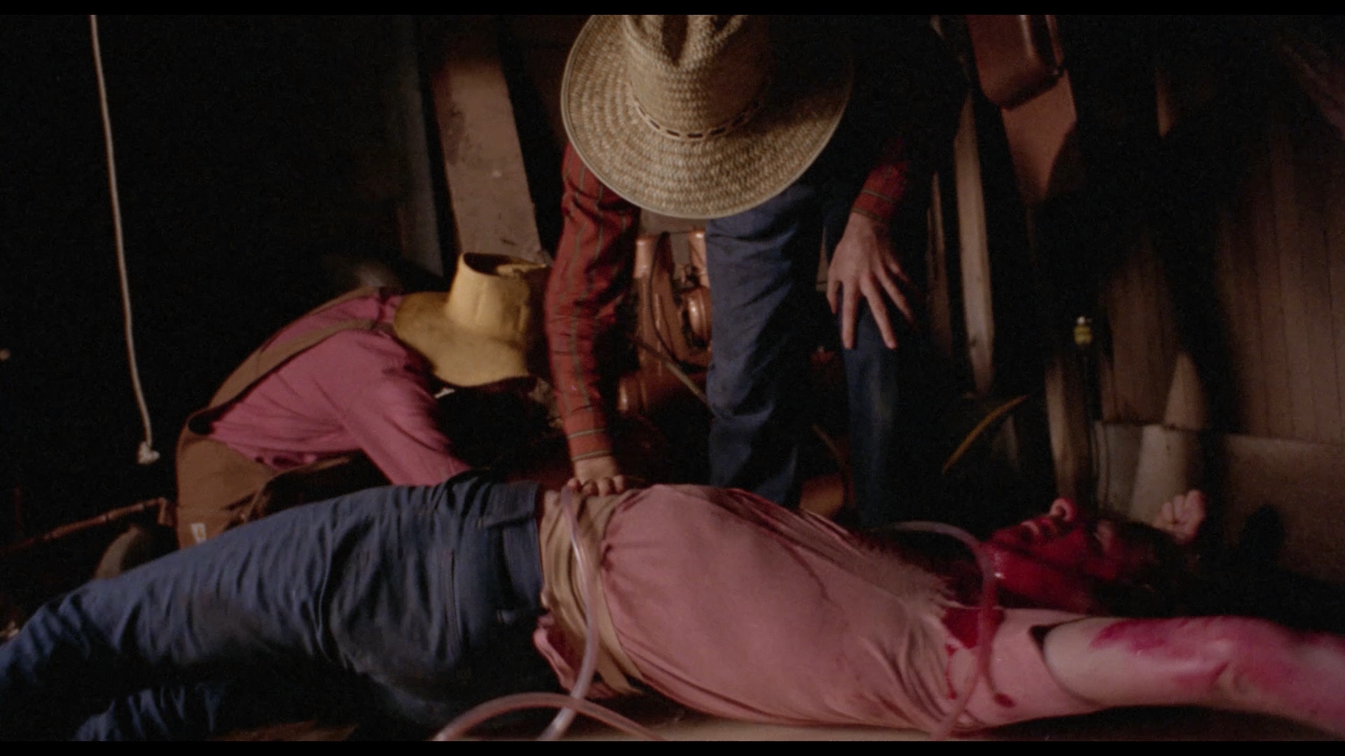 effort. Like the thematically similar Motel Hell, the film uses its rural setting and farmland locations to interesting effect, a far cry from the Gothic castles and bubbling laboratories that had populated horror films in the previous decade. Some sequences in particular, such as an extended bloodletting ritual by masked farmers in a barn, foreshadow the later (and obviously far superior) The Texas Chainsaw Massacre, and while the intensity level is kept at bay by numerous unintentional chuckles (check out the shoe polish hairdos) and gaping plot inconsistencies, there's enough going on to keep fans of Z-grade trash busy munching on their popcorn.