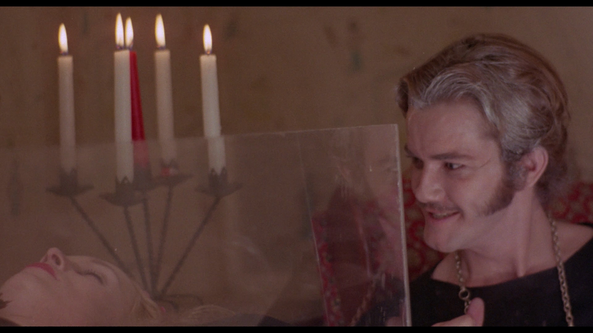 During the fiery, crimson-tinted intro, we learn from a pretty good James Mason imitator about the history of druids who continue to thrive to this day across the globe. Why, they've even shacked up in the great American Northeast, where locals are falling prey to a pair of farmers who bleed their victims in a wooden shack. A nasty incident at a local bar in which a man collapses dead from means unknown triggers a local investigation, which touches on the bizarre experiments of one Dr. Anderson (Kelley). The scientist's tinkering with human blood triggers the interest of our modern druids, led by the not terribly imposing Creton (Jennings). It seems their bloody actions (which include ambushing people in the shower) can all be justified because they intend to revive their dead queen, a beautiful blonde kept preserved in a glass coffin.