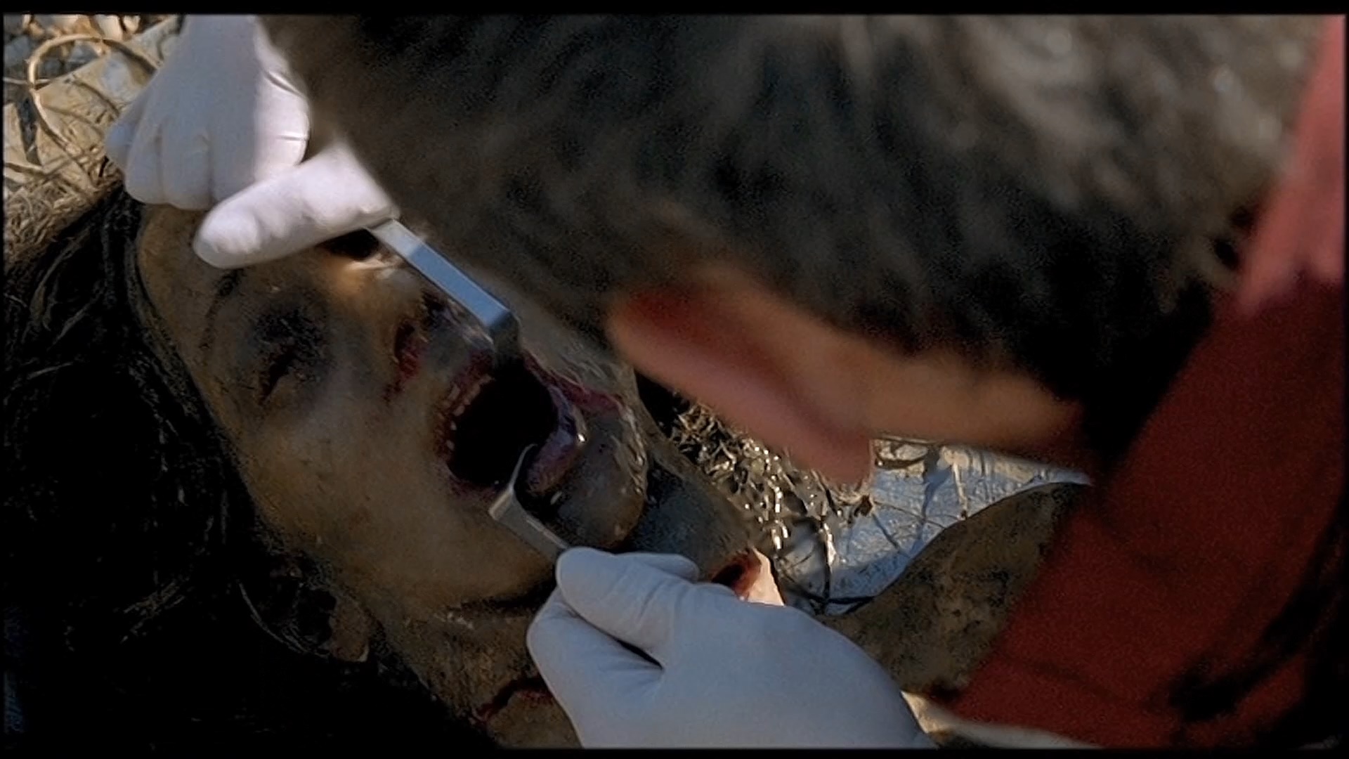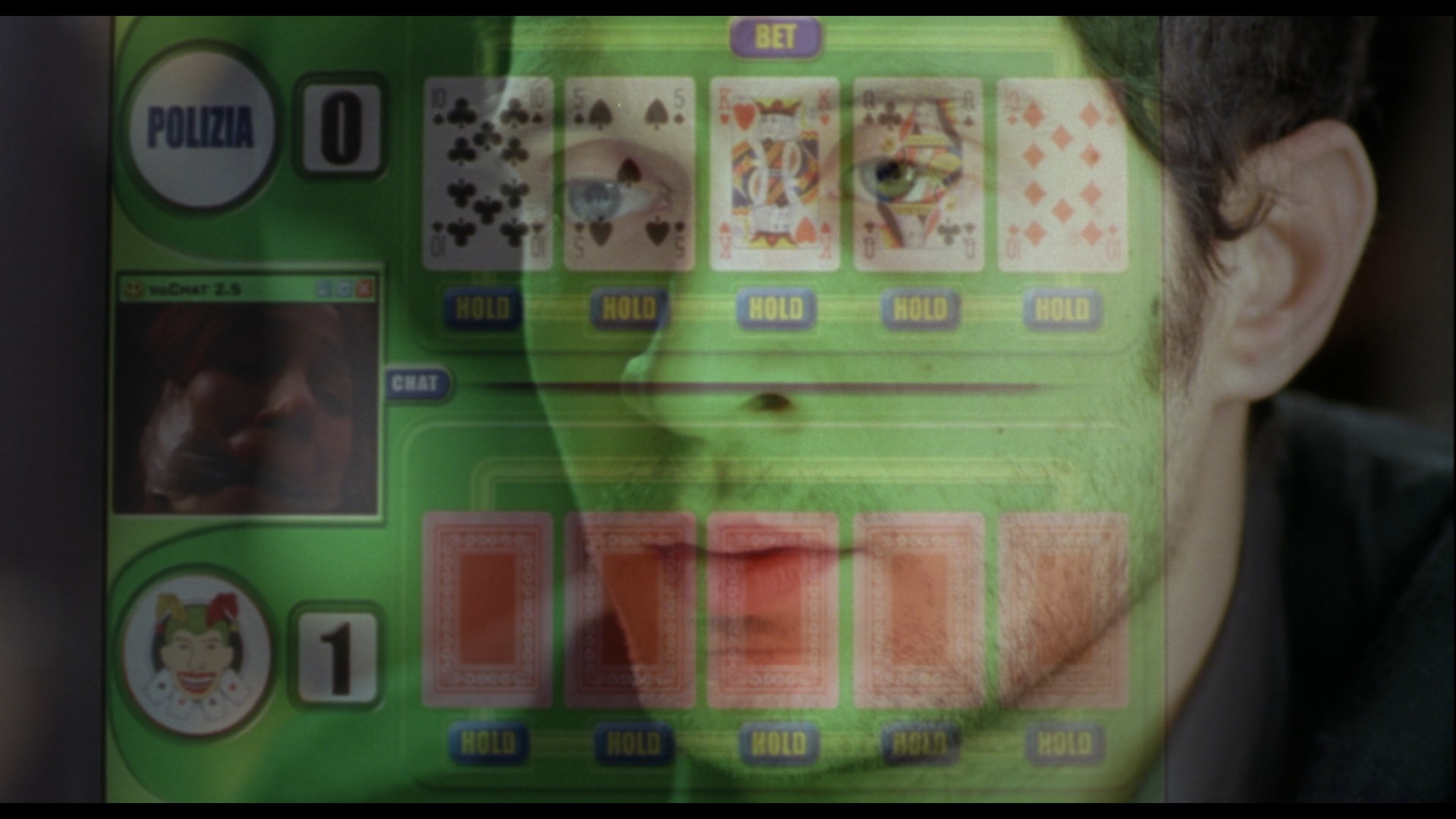 In 2012, The Card Player made its first Blu-ray appearance as a limited Blu-ray/DVD mediabook from Austrian company Tonfilm with English and German DTS-HD MA 2.0 stereo tracks and German subtitles. The transfer's HD for sure and opened up slightly to 1.78:1 compared to the 1.85:1 seen everywhere else, but it's hampered by some edge enhancement and inconsistent, somewhat flat colors; most damningly, the German source used here is pulled from an element that had been censored very significantly for local theaters, and the missing bits have been slotted in using the old 1.85:1 standard def source. That The Card Playermeans there are some obvious drops in quality for all the nastier shots involving dead bodies (including the water mouth gush) as well as shifts in aspect ratio; see the second frame grab comparison below for an example. Extras on that disc include the promo and making-of featurettes The Card Player(running the correct speed at 11m54s and 8m50s) in Italian w/German subs, a reel of English-language titles and insert shots (7m30s) for the film versus the Italian ones seen in the main feature (which makes the chat room scenes incomprehensible for English-speaking viewers), and a poor quality 4x3 English trailer. A subsequent German Blu-ray from Sunfilm was also briefly released but was reportedly censored and not available here for comparison.