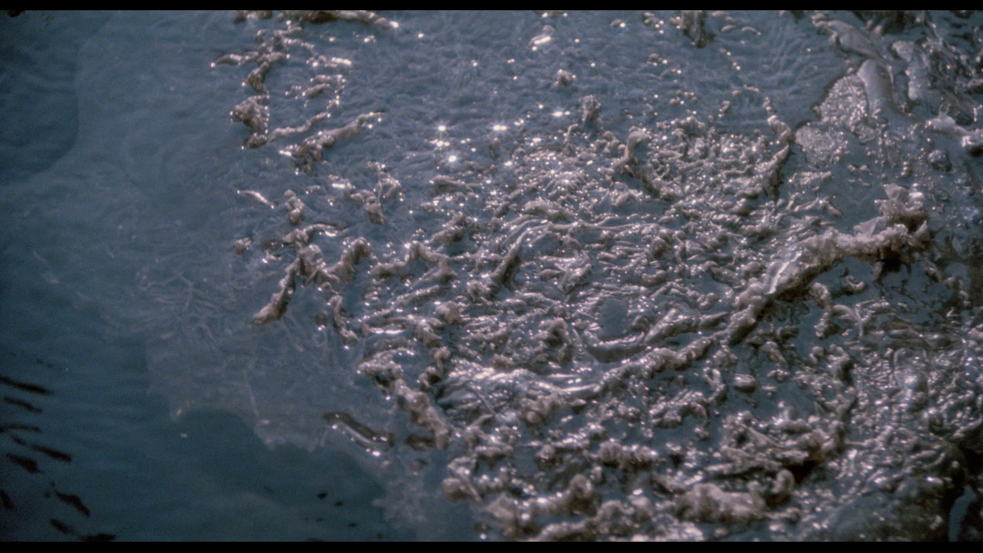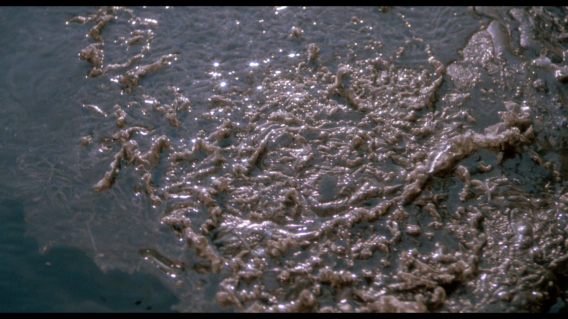 features four pot-smoking teens hopping onto a large raft aloft in an isolated lake, only to be surrounding by a large carnivorous mass resembling an oil slick. Though light on story, the tale moves along at a nice clip and features some memorable horrific highlights, including a terrific sucker punch climax.