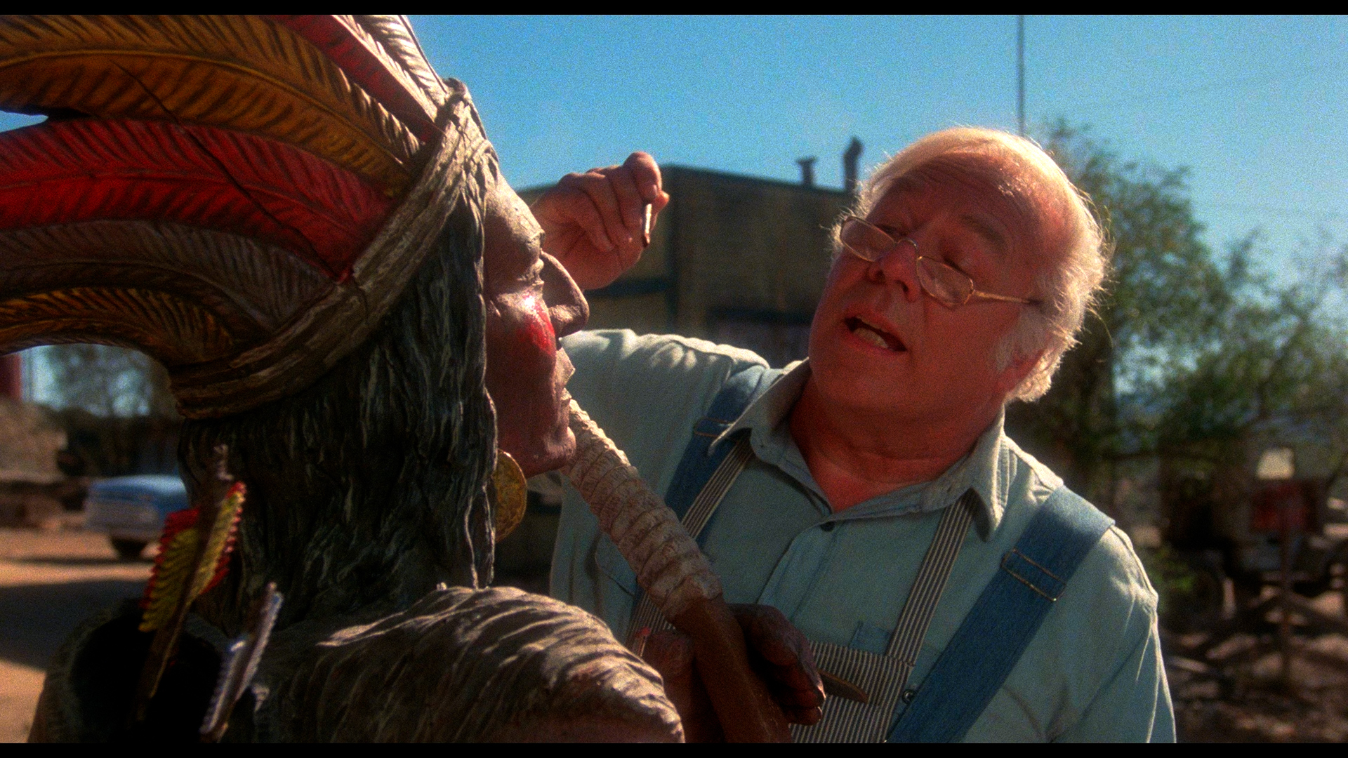 First up is "Old Chief Wood'nhead," which stars George Kennedy and Dorothy Lamour as a couple of shop owners near Indian territory in the desert. Despite their failing business, George keeps up good relationships with the natives and takes care of the large wooden Indian adorning the front of his store. When the chief of the local tribe rewards George for his service with some precious jewels, the chief's son and his delinquent friends crash the store, intending to grab some quick