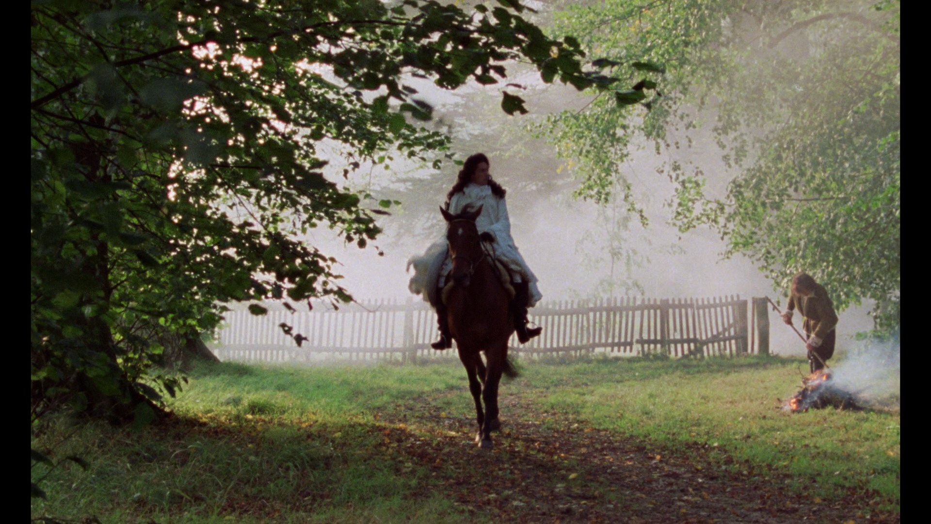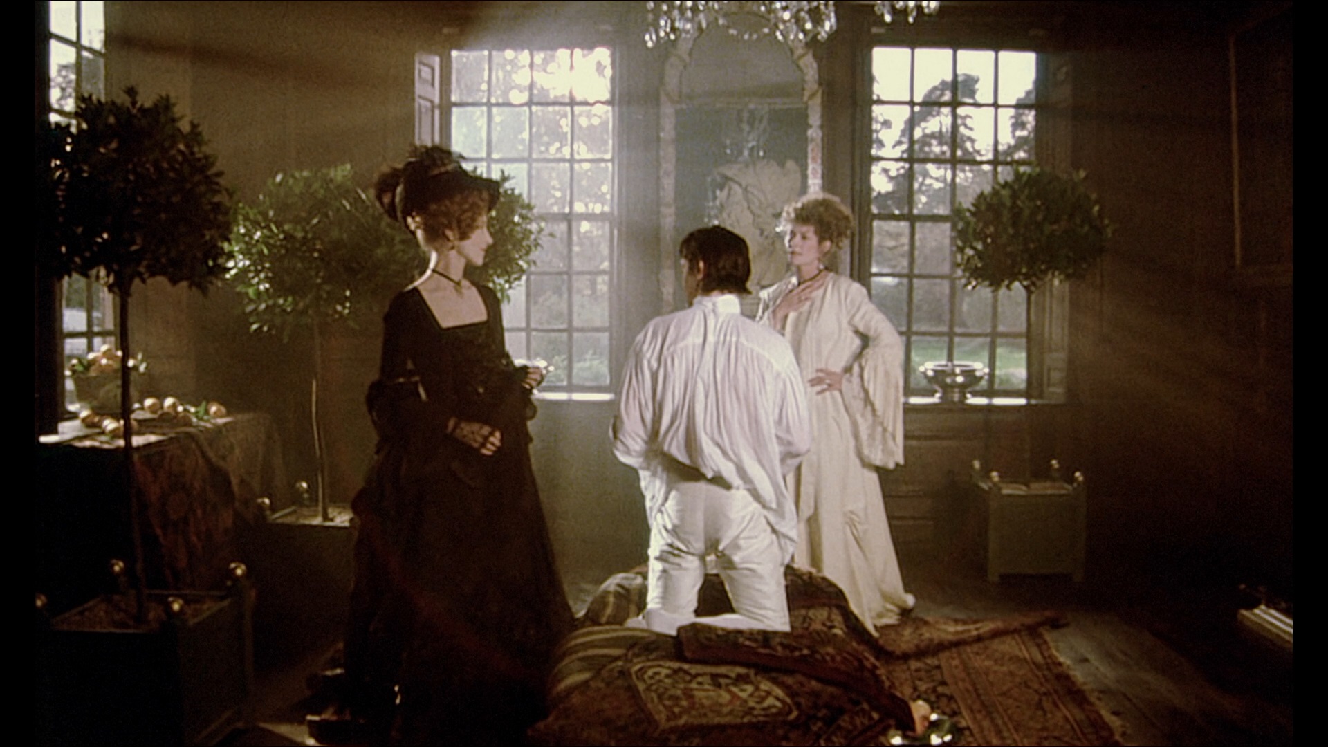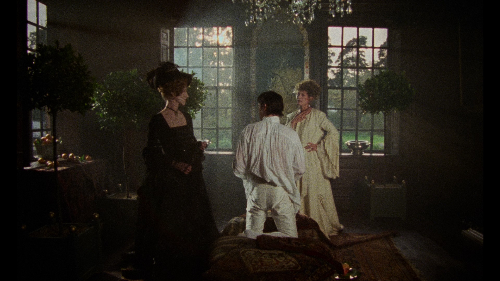 BFI and Zeitgeist DVD releases were followed by several editions including a Japanese Blu-ray from HanWay (featuring all the DVD extras but looking washed out and very desaturated), and Spanish and German Blu-rays that look almost identical to that one. Thank you to the estimable Tony Strauss for providing the discs for comparison, seen below. In 2022, the BFI reissued the film as a limited theatrical engagement and a two-disc Blu-ray set featuring a tremendously improved transfer from a fresh 4K restoration by the BFI National Archive. Colors are more vibrant but convincing (especially the reds and greens) while the whites have far more gradation than before, revealing details in paper texture and clouds that simply weren't there before. The LPCM 2.0 English mono track is also in mint condition and comes with optional English SDH subtitles as well as an audiodescriptive track (which can get very funny at times for reasons you can imagine) and a German dub and subs. The first disc also retains the original commentary, Peter Greenaway video intro, on-set footage and interviews, behind the scenes footage, the original and 2022 restoration trailers, and an expanded 4m9s gallery. Interestingly, all four deleted scenes are present here-- but you get two outtakes as well showing lengthy, bright views of the fatal aftermaths of the two homicides in the film.