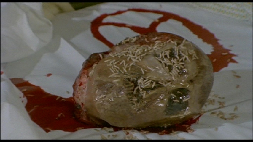 county morgue and taking off with random body parts. One of the parties responsible is soon caught in the act of eating flesh and pursued until he plummets to his death out of a window,