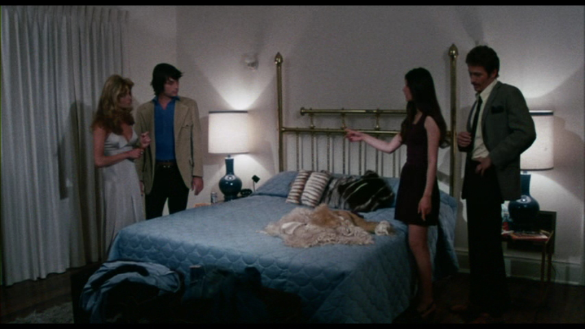 Lest you think that Group Marriage is aiming for a deep sociopolitical statement, bear in mind that this is still first and foremost an exploitation film starring two Playboy Playmates, Vetri and the late Claudia Jennings. The T&A quotient is fairly high here, though as usual for Rothman films, it's handled in a very self-aware and satirical fashion beyond what most male filmmakers (besides Jonathan Demme) would attempt. Surprisingly, she also coaches an effective performance out of Vetri, who was usually cast as a blank-eyed mannequin aside from her brief and haunting role in Rosemary's Baby (under her infrequent stage name, Angela Dorian). Incredibly, she's currently behind bars for the 2010 shooting of her boyfriend, which gives this film a very different slant in retrospect. However, the most interesting thing about this film from a current political standpoint is its inclusion of a gay couple who want to get married, too; it's a subplot that's treated with a surprising amount of gravity and reaffirms this as a film quite a bit more progressive than you might imagine.