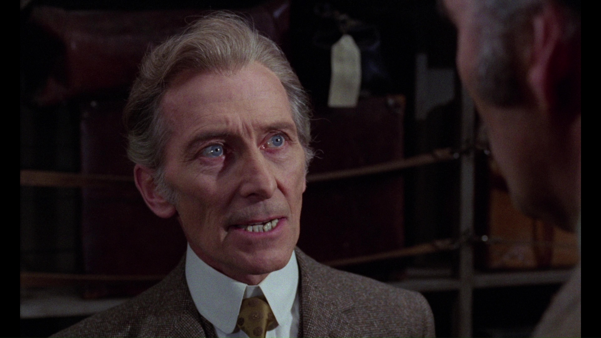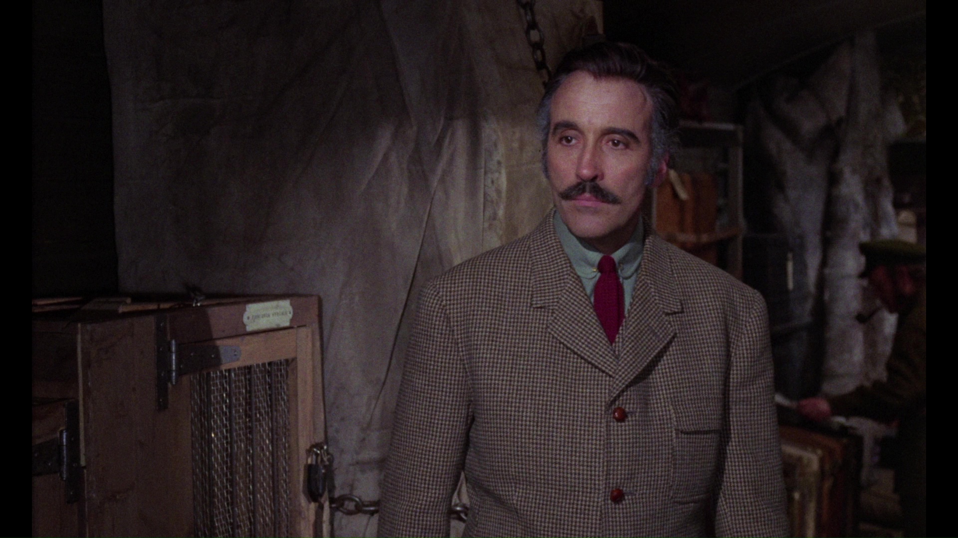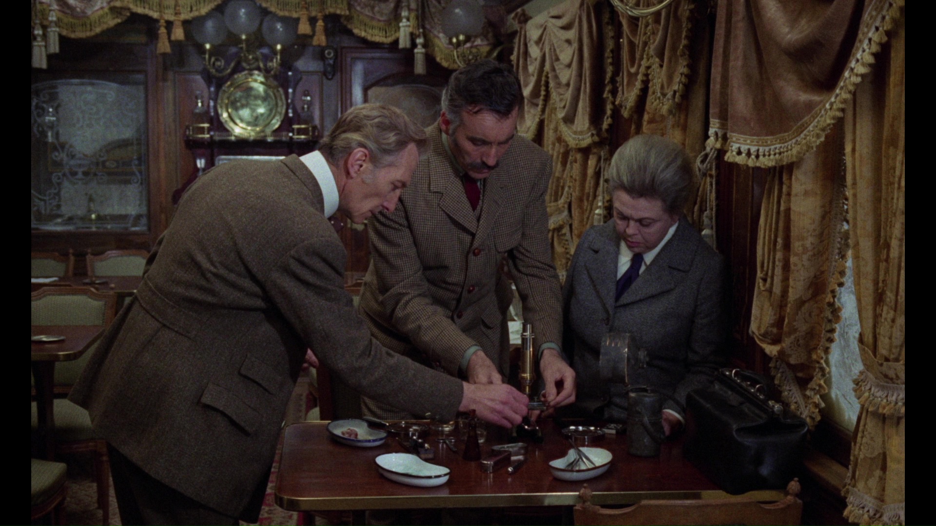 In 2019, Arrow Video offered the film with its first fresh scan in several years, and the difference is quite a significant improvement with much finer film grain, added detail, and a more natural color shift away from the orange cast on the earlier Blu-rays (closer to the cooler look on the Image DVD). The train interiors in particular look much richer with fabrics and glass patterns registering more strongly, and the dark scenes are more atmospheric by a fair margin. (Frame grabs in the body of this review are from the Arrow; comparison ones can be seen below.) The usual English LPCM track is included here, sounding quite nice, with optional English SDH subtitles. The master for this 2K-sourced presentation features the English opening credits and Spanish ones at the end. Ported over from the Severin disc are the "Murder on the Trans-Siberian Express," "Notes from the Blacklist," and "Telly and Me" featurettes, the Alexander intro (playable before the film), and the theatrical trailer, so hold on to the older one if you still want the Cushing audio interview. A new audio commentary with Stephen Jones and Kim Newman takes an appreciative tour through the making of this film including the people behind it, the status of Spanish horror cinema at the time, the differences in Lee and Cushing's acting approaches, and the ambitious, rich nature of the film somewhat camouflaged by its most familiar English title. "Ticket to Die" with screenwriter Steve Haberman (8m31s) examines the film in the context of '70s horror films in the wake of Hammer and as part of Martin's filmography, with some fun thoughts on the contrasting functions and styles of the three leading men as well as the clever use of only two train cars for the shoot. Then filmmaker Ted Newsom turns up for "Night Train to Nowhere" (15m8s) focusing on the role of Gordon, whom he knew, including his career up to this film, the challenges of keeping Cushing involved after the death of his wife, the challenge of booking indie films, and the narrative debt to "Who Goes There?" The package also comes with a reversible sleeve featuring a new design by Graham Humphreys and, in the first pressing only, an insert booklet with liner notes by Adam Scovell.Updated review on January 19, 2019