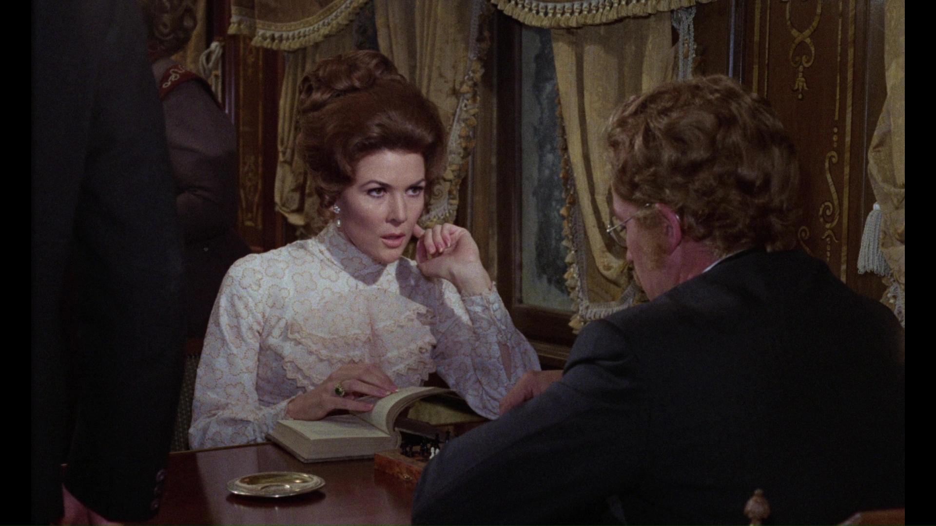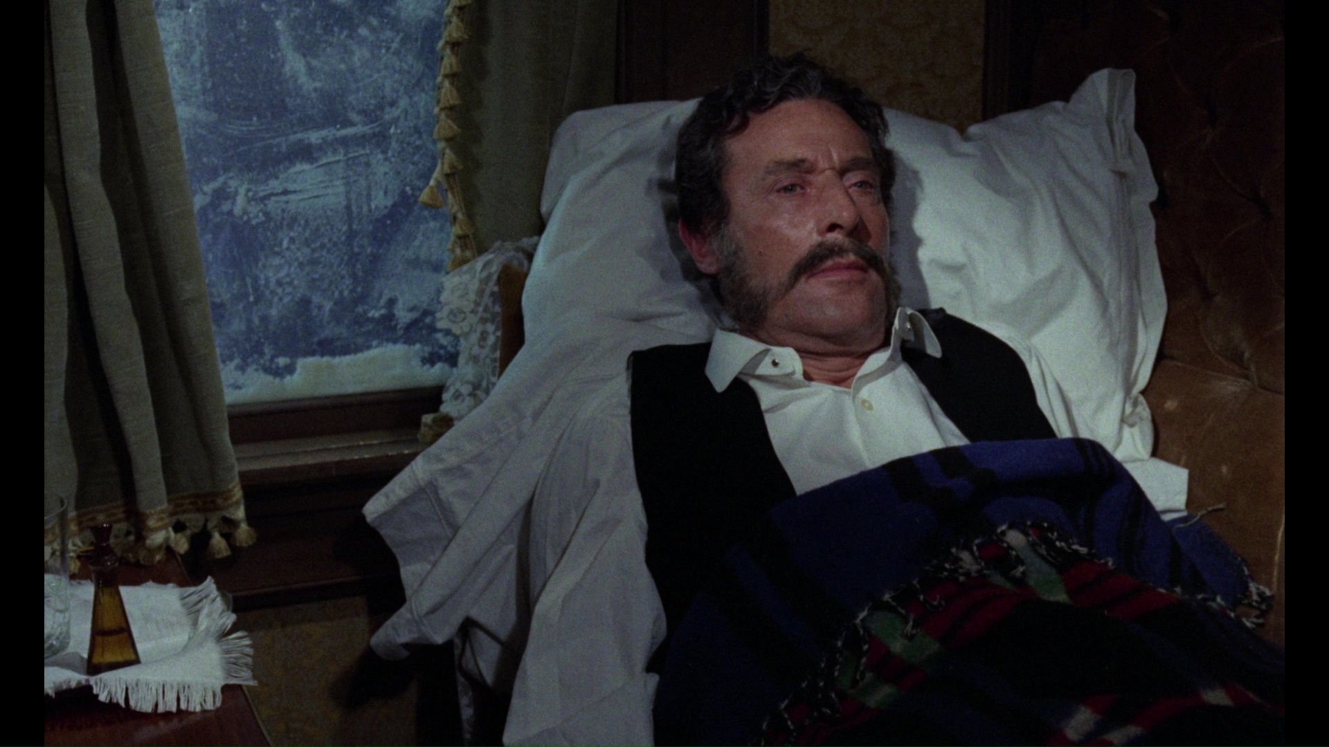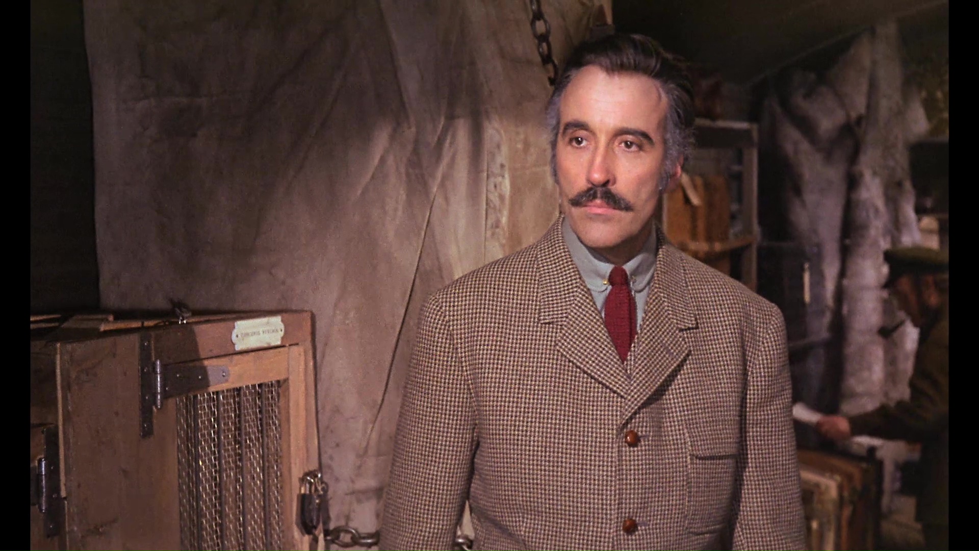 In 2019, Arrow Video offered the film with its first fresh scan in several years, and the difference is quite a significant improvement with much finer film grain, added detail, and a more natural color shift away from the orange cast on the earlier Blu-rays (closer to the cooler look on the Image DVD). The train interiors in particular look much richer with fabrics and glass patterns registering more strongly, and the dark scenes are more atmospheric by a fair margin. (Frame grabs in the body of this review are from the Arrow; comparison ones can be seen below.) The usual English LPCM track is included here, sounding quite nice, with optional English SDH subtitles. The master for this 2K-sourced presentation features the English opening credits and Spanish ones at the end. Ported over from the Severin disc are the "Murder on the Trans-Siberian Express," "Notes from the Blacklist," and "Telly and Me" featurettes, the Alexander intro (playable before the film), and the theatrical trailer, so hold on to the older one if you still want the Cushing audio interview. A new audio commentary with Stephen Jones and Kim Newman takes an appreciative tour through the making of this film including the people behind it, the status of Spanish horror cinema at the time, the differences in Lee and Cushing's acting approaches, and the ambitious, rich nature of the film somewhat camouflaged by its most familiar English title. "Ticket to Die" with screenwriter Steve Haberman (8m31s) examines the film in the context of '70s horror films in the wake of Hammer and as part of Martin's filmography, with some fun thoughts on the contrasting functions and styles of the three leading men as well as the clever use of only two train cars for the shoot. Then filmmaker Ted Newsom turns up for "Night Train to Nowhere" (15m8s) focusing on the role of Gordon, whom he knew, including his career up to this film, the challenges of keeping Cushing involved after the death of his wife, the challenge of booking indie films, and the narrative debt to "Who Goes There?" The package also comes with a reversible sleeve featuring a new design by Graham Humphreys and, in the first pressing only, an insert booklet with liner notes by Adam Scovell.Updated review on January 19, 2019