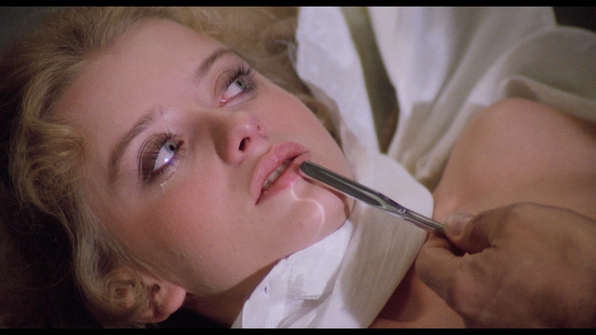 The first Blu-ray release of the film came out in Italy in 2014 with a tremendously flawed transfer riddled with that perpetual local annoyance, rampant scanner noise, which results in a coarse and artificial image that looks like it's been layered with a distracting Photoshop filter. The English track is missing here, but oddly enough, it does have the Italian track with optional English subtitles. The subsequent U.S. Blu-ray from Code Red in 2016 tries to mitigate the damage as much as possible with a great deal of additional color correction and more balanced black levels, but there's only so much you can do with such a deeply compromised master. Like the Italian disc, it's also moderately windowed on all four sides for no good reason; in this case the presumably textless opening credits of the master have been augmented with new, digitally-created English credits that don't look convincing at all; fortunately the Italian closing titles remain intact. The DTS-HD English mono track sounds modest as well, with hiss and crackling throughout. Extras are essentially the same as the Media Blasters release, namely the three video interviews and the English trailer.