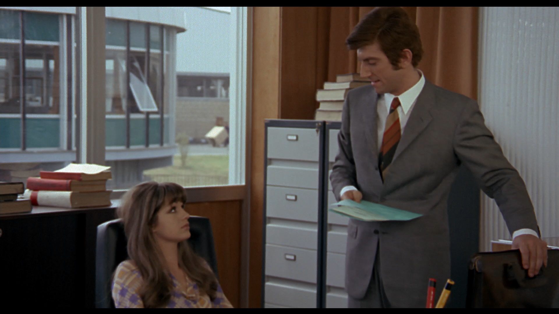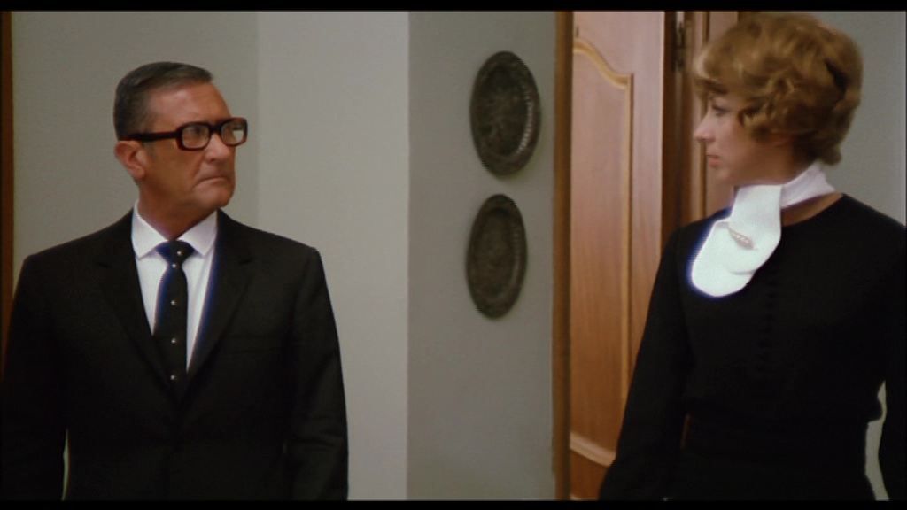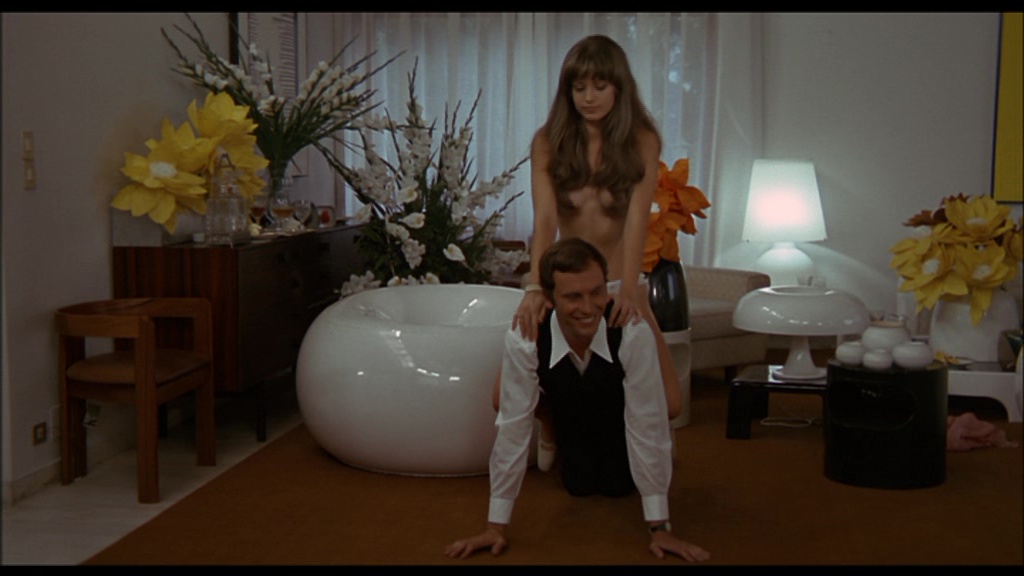 As for video extras, you get two U.S. Audubon trailers (both reconstructed in HD), followed by "Futurism and Frivolity" (26m58s), a video essay by Rachael Nisbet noting how the protagonist's sexual awakening is mirrored by the choices in the production design, as well as the importance of some of its aesthetic contributors and recurring visual motifs. Then "Trovajoli: Postlude" (28m10s) is an informative Skype session with Lovely John covering the background of the Gershwin-loving composer and the pivotal tracks from his delicious score to this film. (Unfortunately he badly mangles Trovajoli's last name throughout the piece, so be prepared.) An expanded reel of outtakes an deleted scenes (16m14s) is presented here in much higher quality than ever before, including all of the lingering stag film footage and a very clear look at the face of Spaak's body double-- not to mention plenty of coverage of Philippe Leroy being absolutely ridiculous, all set to sumptuous highlights from the soundtrack album. A rundown of the film's U.K. censor cuts (2m27s) highlights the extensive and sometimes baffling demands made to get it in releasable form, including the removal of the beetle brooch scene. A TopFilm fotoromanzo (2m42s) presents black-and-white photo highlights in the usual comic book form of the era, followed by a very extensive image gallery (9m4s) with posters, stills, and other odds and ends from around the world including the U.S., U.K., Italy, France, Germany (as Huckepack), and Japan. Finally the disc closes out with the Italian, French, and English international trailers (the latter as The Aristotle Perversion), the English and French credit sequences, an interesting 4m41 Japanese video promo for the DVD release, and a 1m4s gallery of Audubon Films posters.