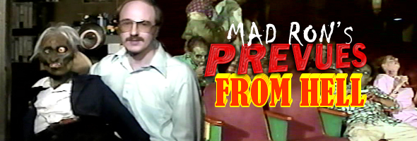 Long before the advent of incredible trailer comps like the indispensable 42nd Street Forever series, and way way way before fake trailers became online staples, horror fans had to often search far and wide to track down the trailers for their favorite films, which were never included on VHS tapes and only occasionally on these antiquated things called laserdiscs. One of the big breakthroughs on this front came in 1987 with a little homegrown classic called Mad Ron's Prevues from Hell, which collected a barrage of the most outrageous, extreme genre trailers in sight and wrapped it all together with shot-on-VHS footage involving a depraved projectionst, Mad Ron (Pawlow), and his wisecracking zombie dummy, Happy Goldsplatt. Soon zombies are invading the theater and eating the concession stand workers, but that doesn't stop the parade of trailers from getting zanier and gorier.